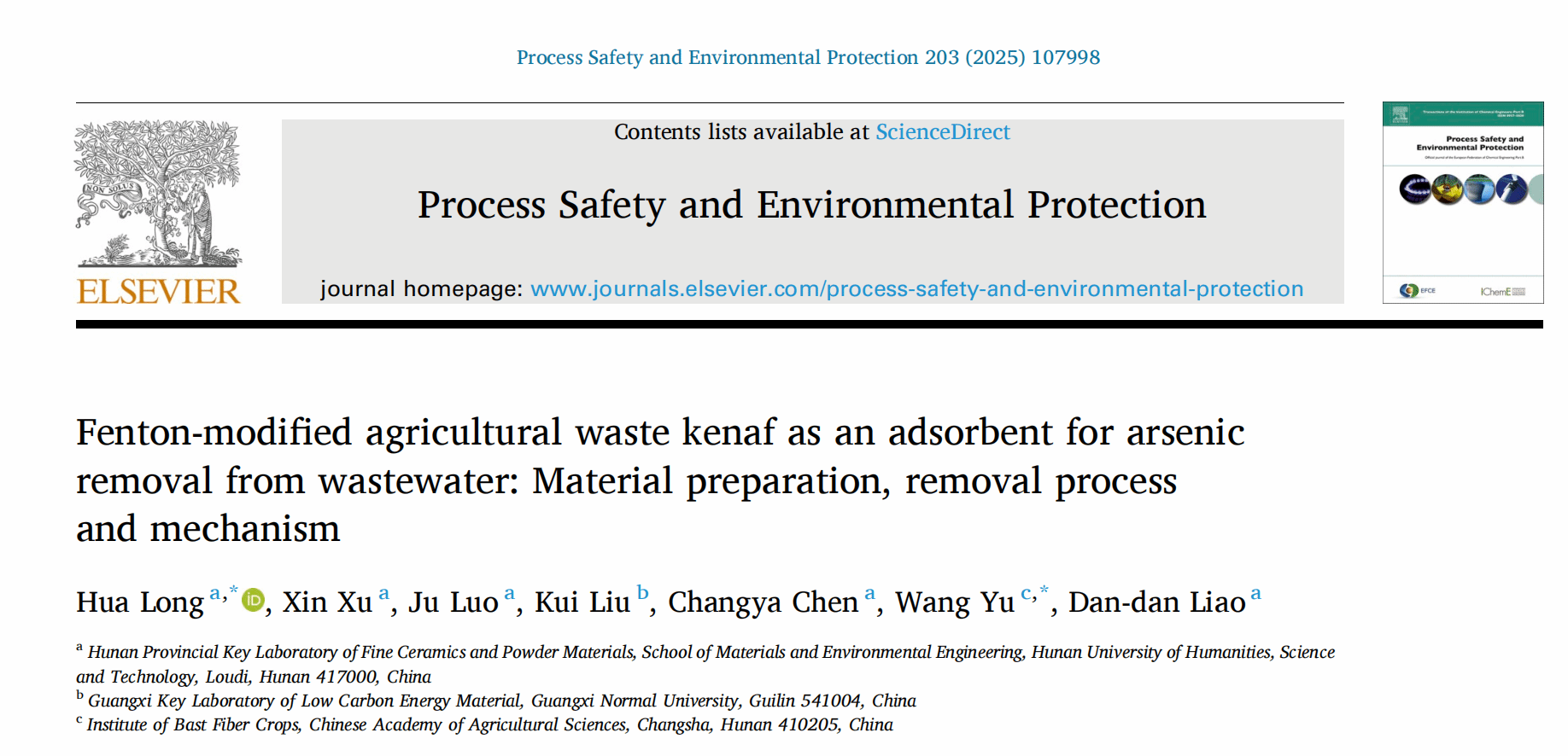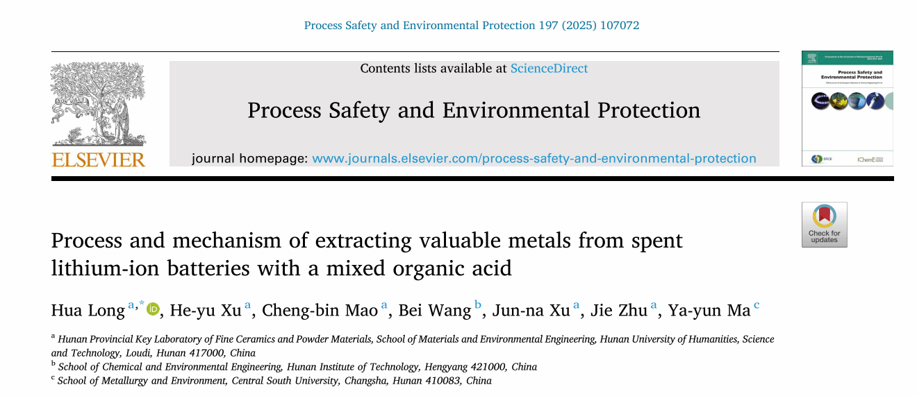 近日,材料与环境工程学院龙华博士团队在环境科学与生态学领域国际Top期刊《Process Safety and Environmental Protection》先后发表两篇重要研究论文,题目分别为“Process and mechanism of extracting valuable metals from spent lithium-ion batteries with a mixed organic acid”和“Fenton-modified agricultural waste kenaf as an adsorbent for arsenic removal from wastewater: Material preparation, removal process and mechanism”。湖南人文科技学院均为论文的第一完成单位。