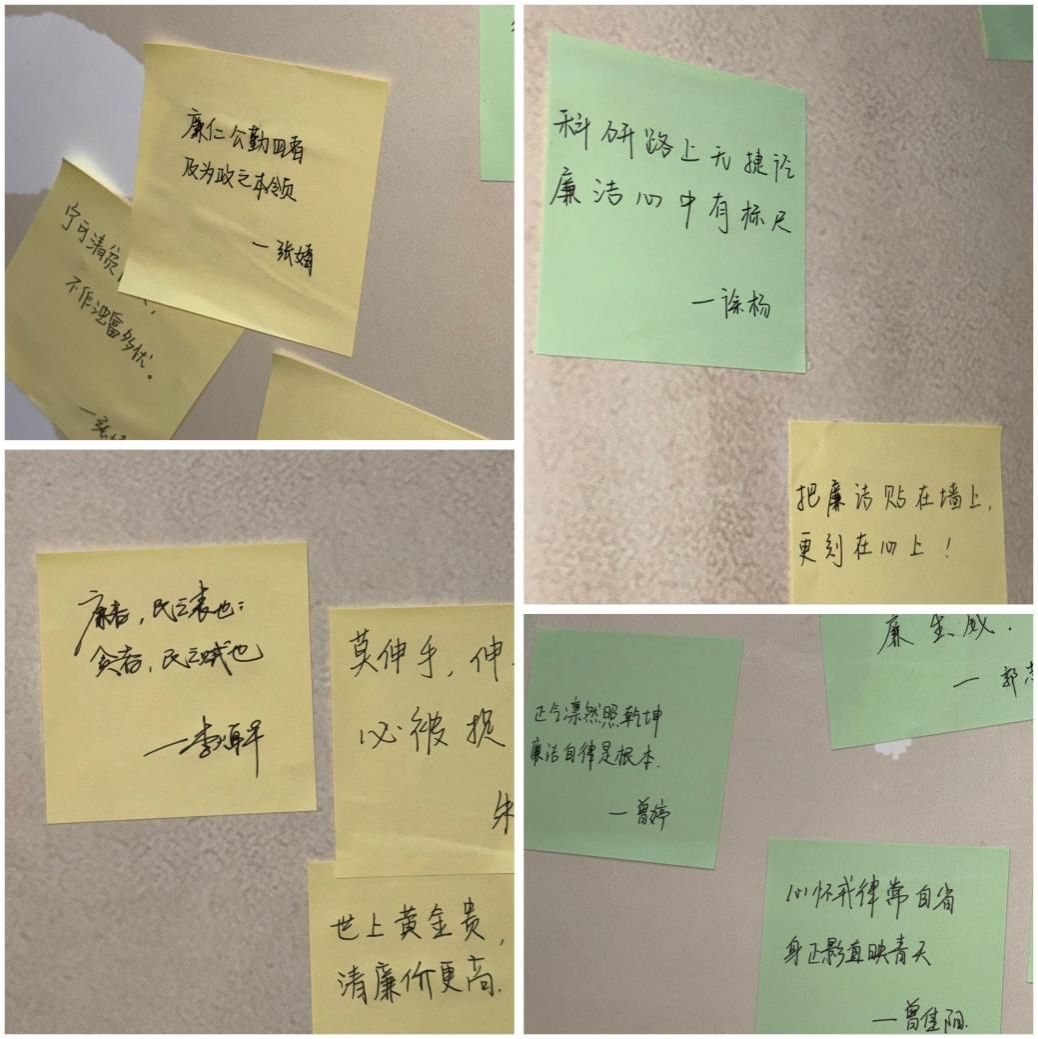 展板上,一句句发自肺腑的格言承诺熠熠生辉:“身正则刚直,行正则威严!”彰显了党员对刚正不阿品格的追求;“世上黄金贵,清廉价更高。” 则深刻诠释了清廉价值的至高无上;“行而不轻!”“一朴涵琦”等简短有力的文字,同样表达了党员们洁身自好、稳重前行的决心,这些凝聚着思考与信念的便利贴,不仅展现了专业特色与廉洁文化的有机融合,更在支部内部营造了“以廉为荣、以贪为耻”的浓厚氛围。