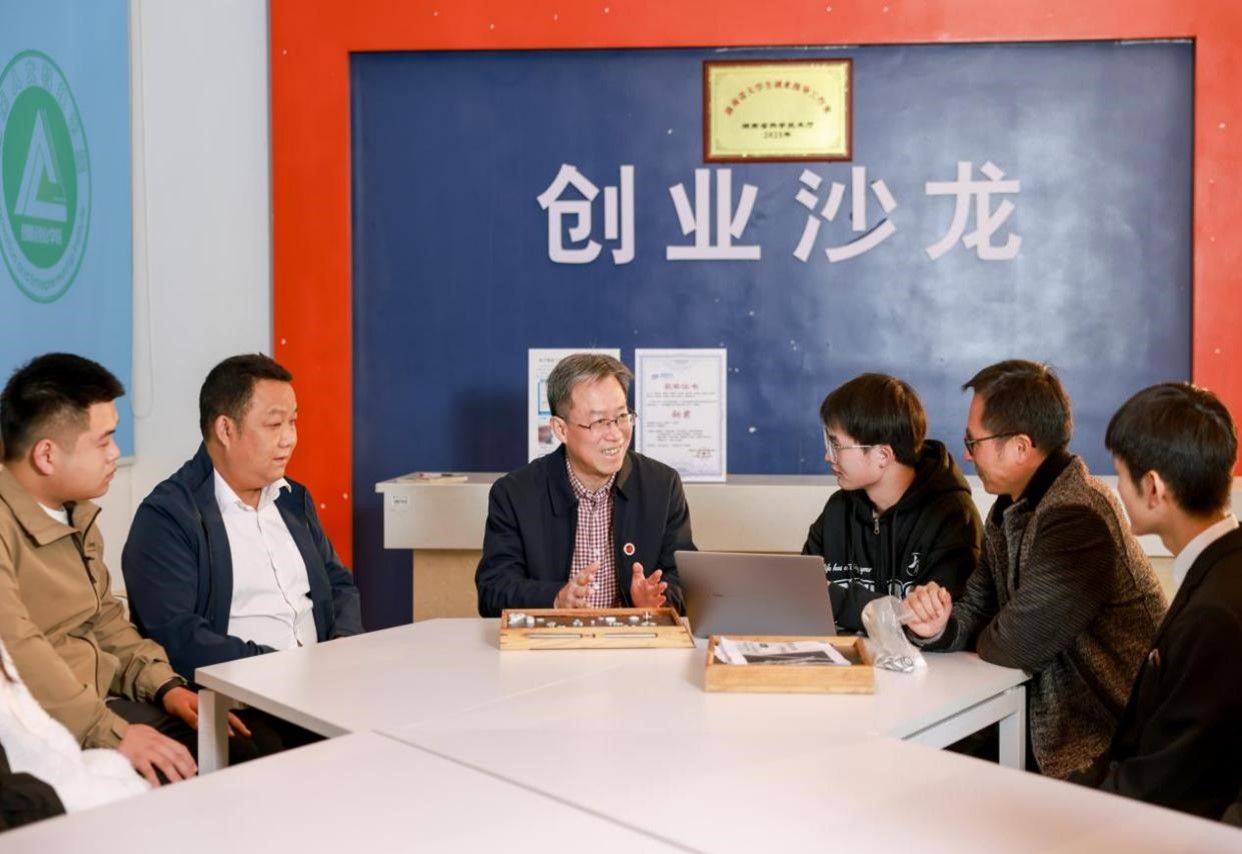 在大学生创业指导工作室,胡凯波与材料与环境工程学院、能源与机电工程学院的创新创业本科生团队及指导教师进行亲切交流。师生代表围绕项目选题、技术攻关、团队协作及孵化落地等方面踊跃发言,分享创业项目的探索实践与阶段性成果。胡凯波不时询问关键技术创新细节与市场应用前景,对师生们立足学科前沿、面向实际需求开展创新探索的精神给予高度评价。他特别指出,创新实践教育要注重引导学生从“实验室”走向“应用场”,在真实问题中锤炼创新能力。