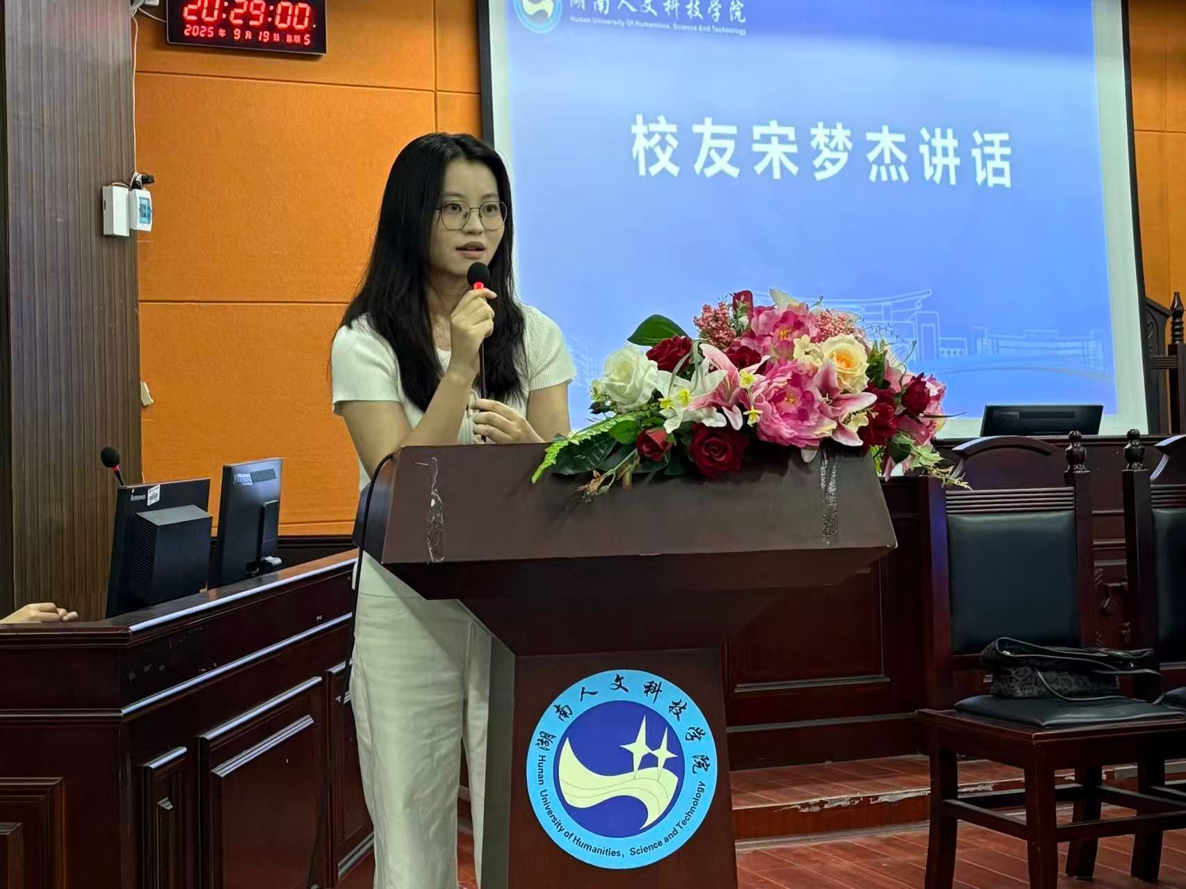 校友代表张楚平以轻松幽默的方式与新生展开交流,通过对比大学与高中生活的差异,强调法学专业学习自主自律的重要性,并围绕“你是谁”“你为了谁”“你将成为谁”三个问题引导同学们深入思考自我定位与发展方向,鼓励大家为实现个人理想与家庭期望而努力奋斗。校友宋梦杰则从考研经历出发,激励新生敢于树立远大目标,做好长远规划,始终保持奋进的姿态,不畏艰难、持续努力。