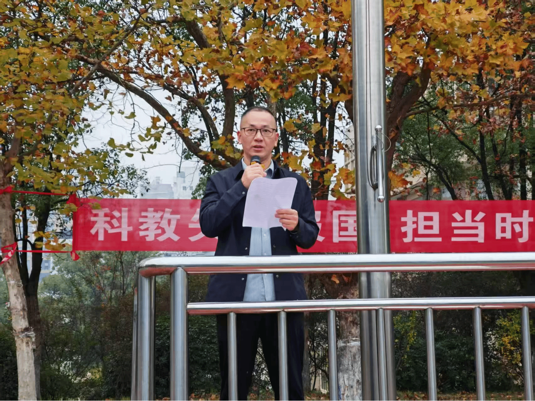 法学院党总支书记肖兵明在讲话中强调,爱国是青年立身之本,号召同学们坚定理想信念、锤炼专业本领,将个人成长融入国家发展,为民族复兴贡献青春力量。