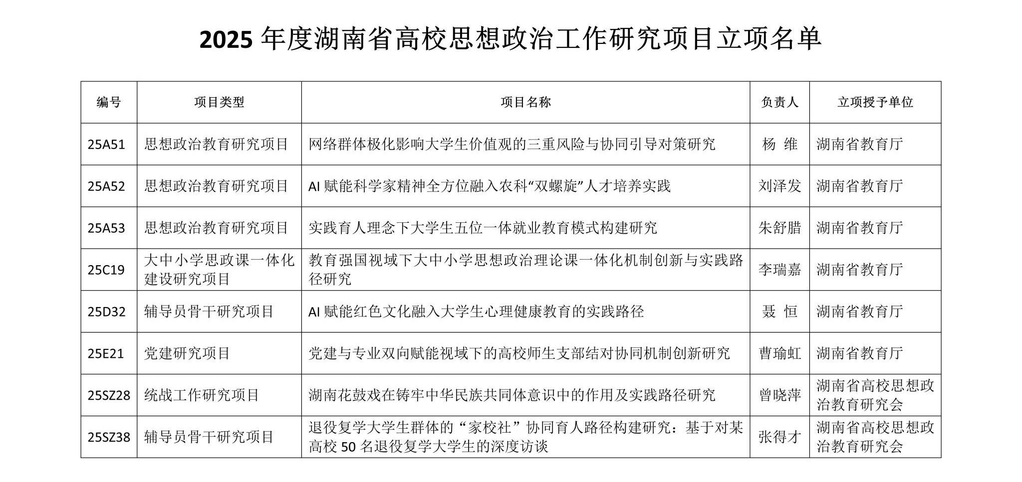 近日,省教育厅、省高校思想政治教育研究会公布了2025年度高校思想政治工作研究项目立项结果。我校共有8项课题获批立项,是近年来最好的成绩。