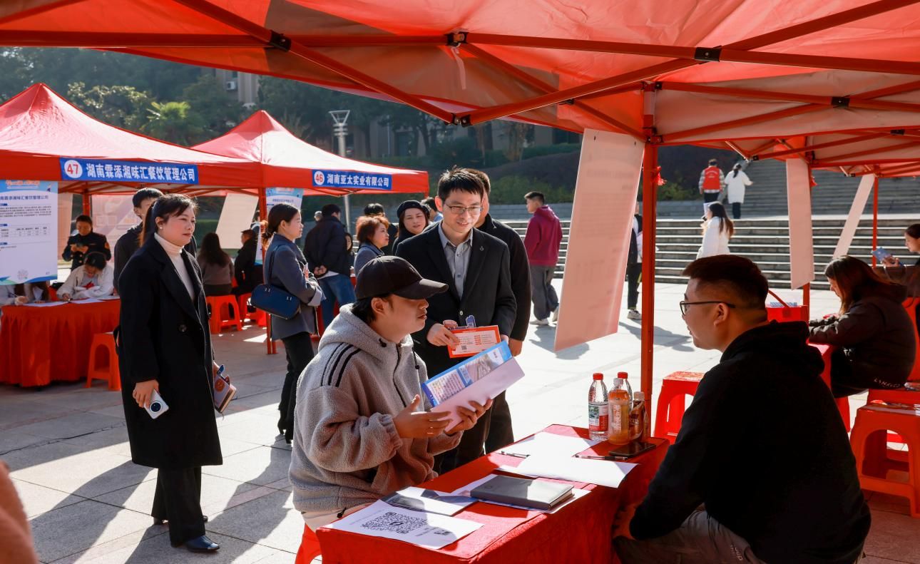 11月28日,“智汇潇湘·才聚湖南”2025年“湘才留湘”校园巡回双选会(娄底站)在我校海园广场成功举办。校党委委员、副校长谭峰亮,娄底市人力资源和社会保障局相关负责人到现场指导。