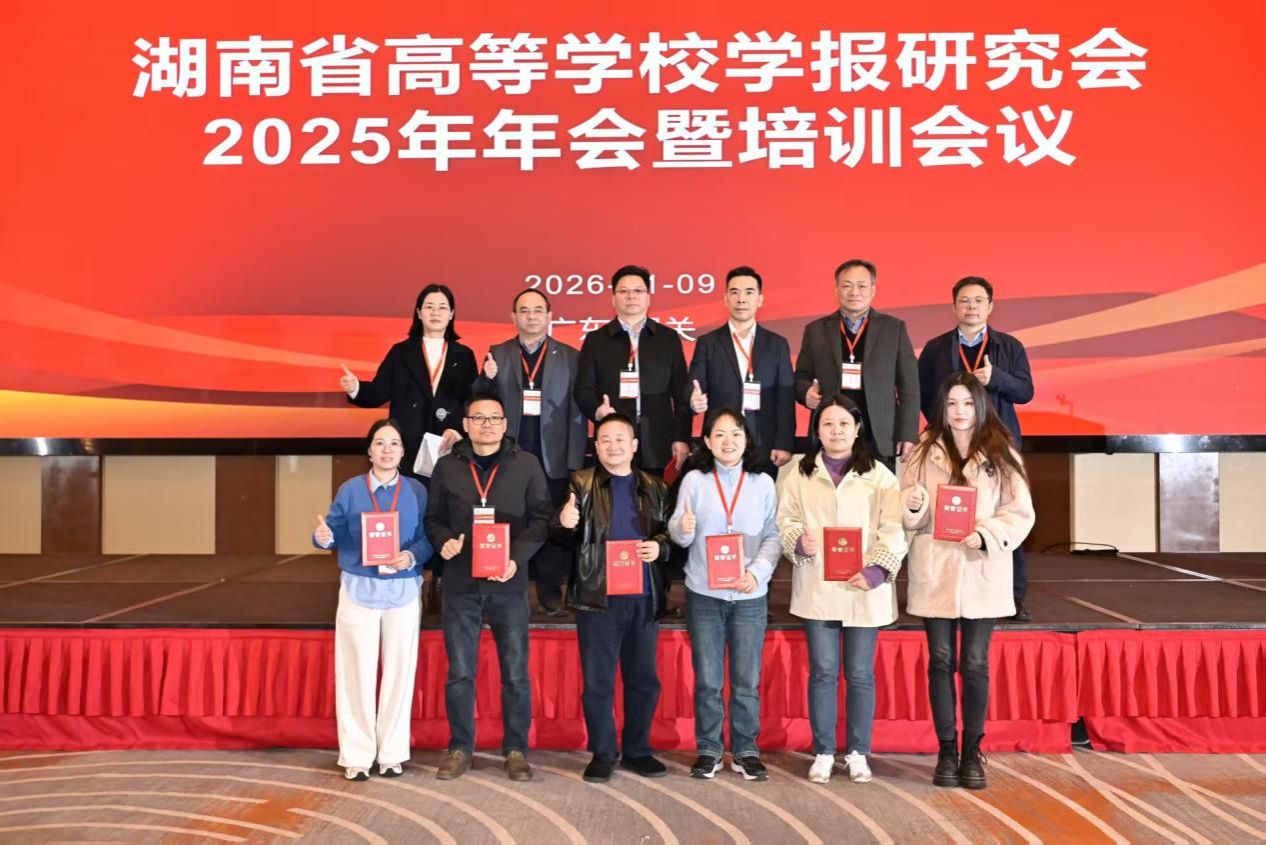 1月8日至11日,湖南省高等学校学报研究会2025年年会暨培训会议在广东韶关举行。会上,我校学报编辑部获评为“湖南省高等学校学报研究会2025年突出贡献单位”,编辑部主任杨国辉获评“突出贡献个人”,编辑彭巍颐荣获湖南省高校学报研究会征文二等奖及“优秀编辑”称号,由邓景文编校的《论中国青年在中国式现代化进程中的使命担当》一文获评“主题宣传好文章”。