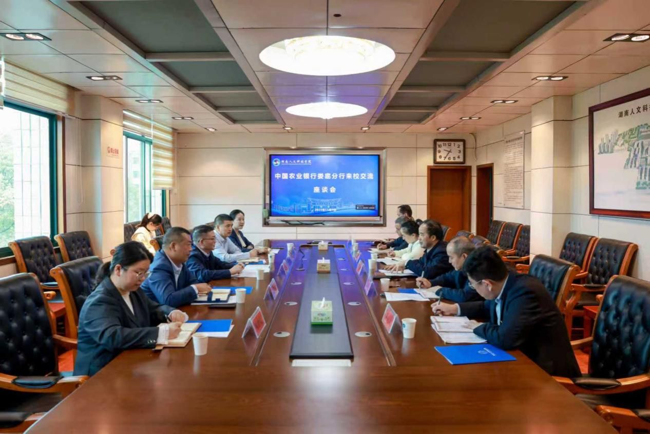 11月7日上午,中国农业银行娄底分行党委书记、行长李晖一行来校座谈交流。在明德楼一会议室,双方就深化银校合作、共谋发展展开探讨。校党委副书记、校长盛明科,党委委员、副校长刘铁峰出席座谈会。