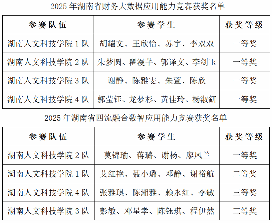 10月31日至11月2日,由湖南省教育厅主办的财务大数据应用能力竞赛、四流融合数智应用能力竞赛相继落下帷幕。我校选派8支团队参赛,在李芳、罗伟祎、粟恒、郑清华4位老师的指导下,凭借扎实的专业功底和创新实践能力脱颖而出,最终斩获省级一等奖5项、省级二等奖1项和省级三等奖2项,刷新我校在此项赛事中的历史最佳纪录。尤其在财务大数据应用能力竞赛中,4支参赛队伍全部荣获一等奖,我校被评选为“优秀组织奖”单位。