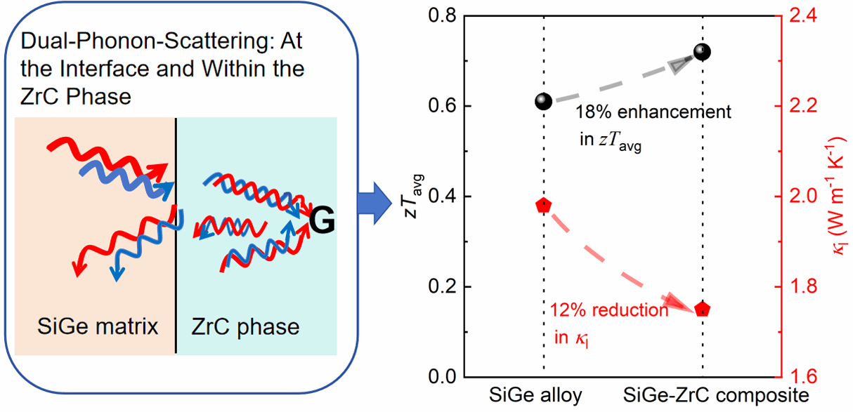 SiGe基热电材料及器件凭借优异的高温稳定性与环境兼容性,成为深空探测领域放射性同位素热电发电机(RTG)的核心组件,但其固有的高导热性制约了能量转换效率的进一步突破,是行业内长期亟待解决的技术瓶颈。刘呈燕博士团队立足这一关键需求,创新性地在n型SiGe材料中引入过渡金属碳化物ZrC,构建起独特的“双声子散射”调控机制,通过显著增强声子散射作用,实现了材料热导率的高效降低。实验数据显示,该改性材料在873 K(约600℃)条件下,峰值热电优值(zT)达到1.3,平均zT值达0.72,为突破SiGe基材料性能瓶颈、提升深空探测器电源系统稳定性与能效提供了重要技术支撑。