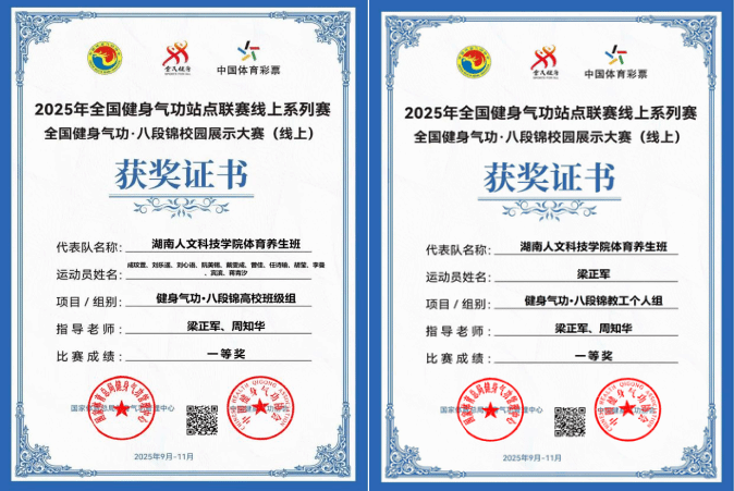近日,国家体育总局主办的2025年全国健身气功站点联赛线上系列赛暨全国健身气功·八段锦校园展示大赛(线上)结果揭晓。学校体育养生班表现出色,荣获健身气功·八段锦项目高校班级组一等奖。梁正军老师荣获教工个人组一等奖。