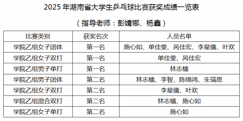 2025年湖南省大学生乒乓球比赛于11月17日在湘潭大学举行,我校乒乓球队奋勇拼搏,发挥出色,在竞争激烈的学院乙组比赛中,一举夺得3金4银的优异成绩。