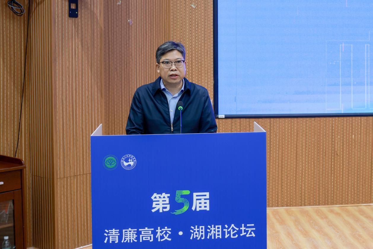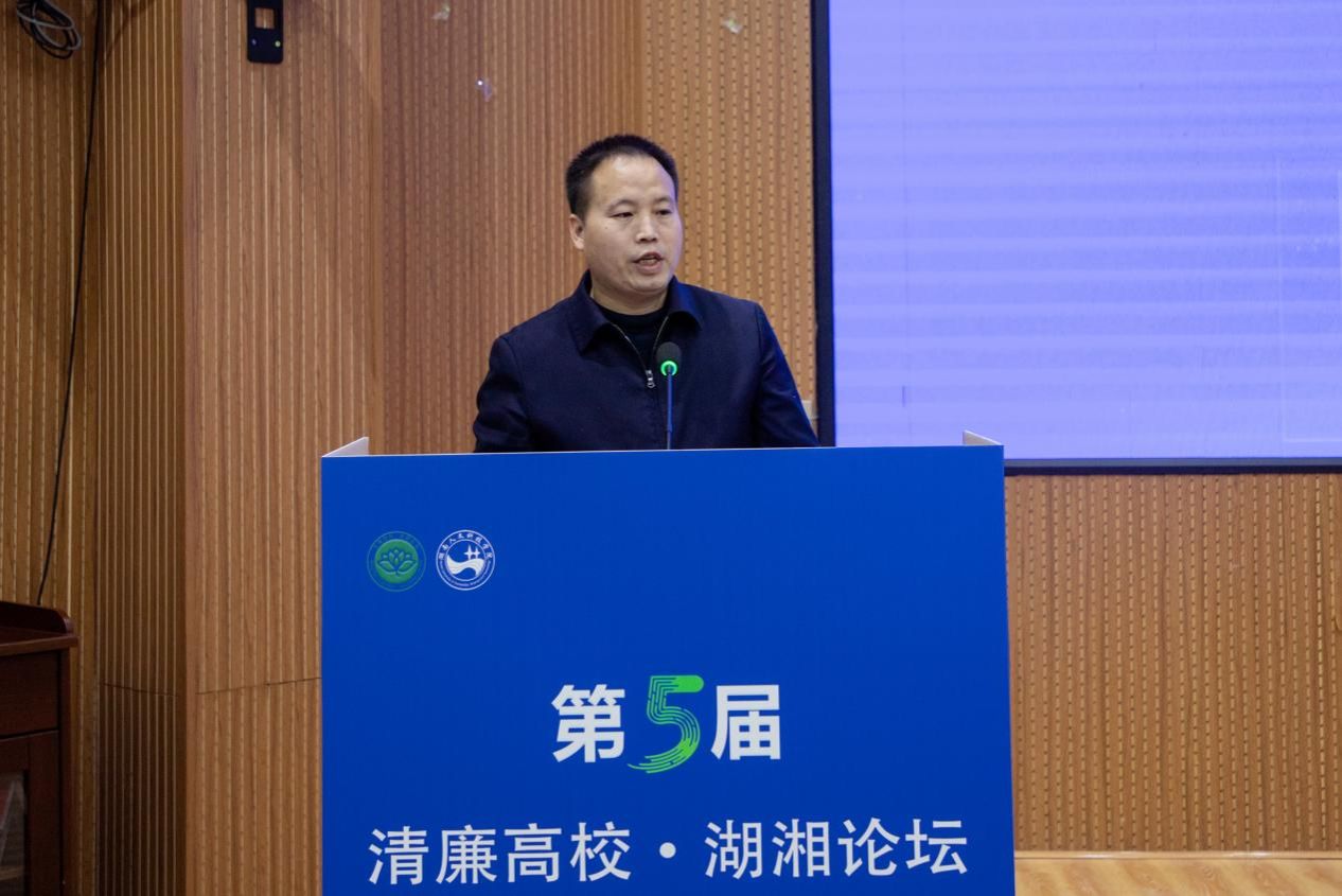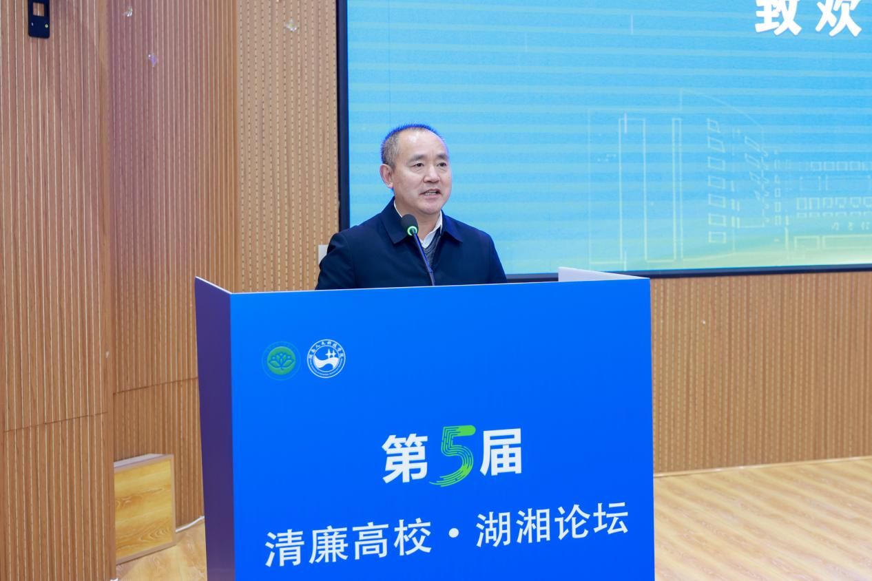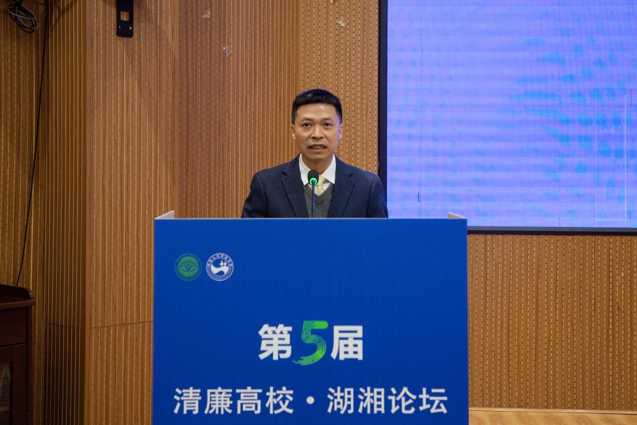 12月5日,由湖南省纪检监察协会主办、我校承办的第五届“清廉高校·湖湘论坛”在学校匠成楼举行。省纪委监委第九监督检查室副主任李慧平、省委教育工委委员、省教育厅党组成员、省纪委监委驻省教育厅纪检监察组组长曾市南,省纪检监察协会副会长、省委党校(湖南行政学院)副校长邓联荣,娄底市纪委常委、市监委委员吴宇峰,我校党委委员、副校长刘铁峰,校党委委员、纪委书记,湖南省纪检监察协会常务理事胡立民出席论坛。开幕式由校党委副书记朱强主持。