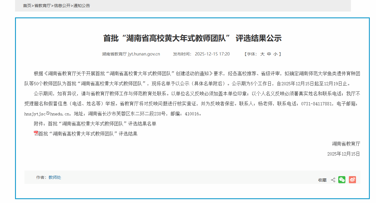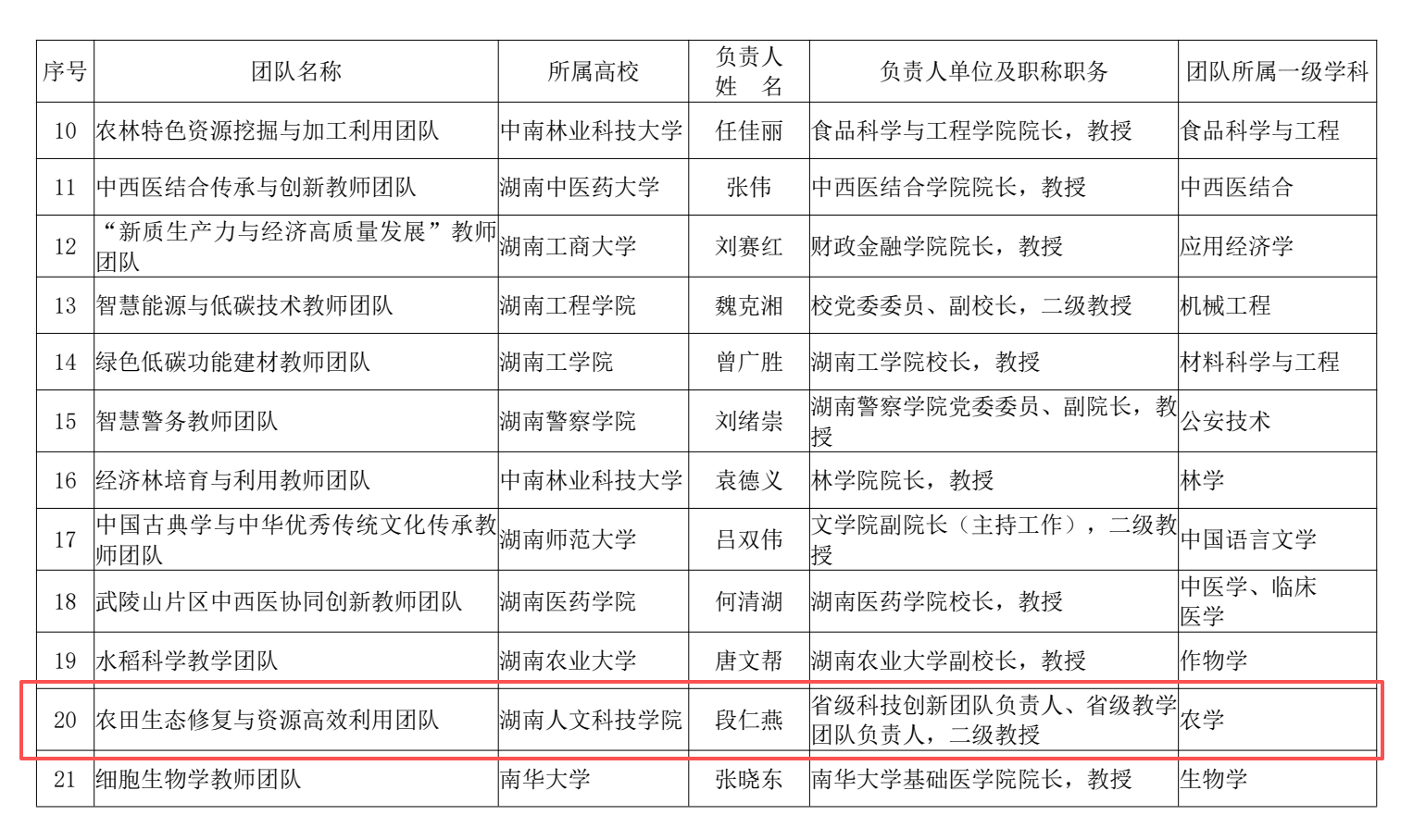 近日,湖南省教育厅公示首批“湖南省高校黄大年式教师团队”名单,我校段仁燕教授负责的“农田生态修复与资源高效利用团队”成功入选。全省高校共有50个团队入选。