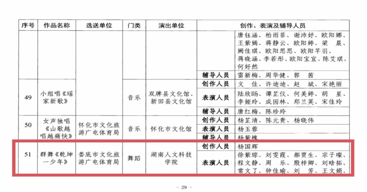 近日,湖南省文化和旅游厅公布2025年全省“欢乐潇湘”新创群众文艺作品评选结果。由湖南省蔡和森与建党思想研究基地首席专家、我校学报编辑部主任杨国辉创作,教务处刘仲春、音乐舞蹈学院肖双婧指导的群舞作品《乾坤一少年》,荣获优秀作品奖。
