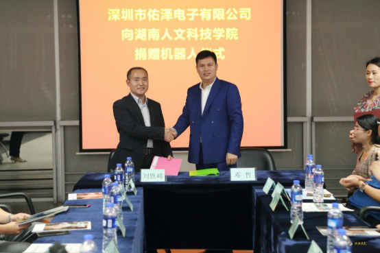 3月15日下午,深圳市佑泽电子有限公司总经理、体育01级5班邓哲校友向母校捐赠工业机器人仪式在深圳市南山区留学生创业大厦举行,副校长刘铁峰出席并代表学校在捐赠协议书上签字,校友办主任刘光辉、能机学院陈新博士、深圳祁阳商会会长丁衡,我校深圳校友会名誉会长曹余辉、副会长彭尚武、副会长兼秘书长王平聚等二十多名校友代表一同参加了捐赠仪式和随后举行的座谈会。