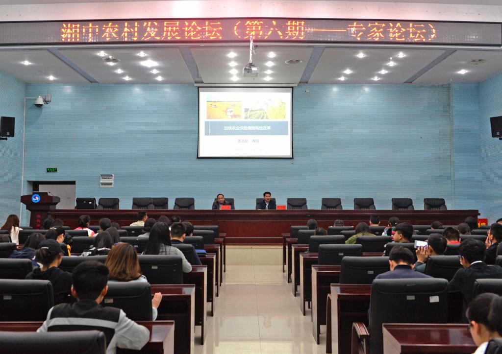 当天上午,在课程结束后又以农业供给侧结构性改革为主题举办了第六期湘中农村发展论坛——专家论坛。湖南农业大学经济贸易学院院长、博导、湖南省农业咨询委员会专家匡远配教授做客论坛,并作《加快农业供给侧结构性改革》主题演讲。湖南人文科技学院副校长周发明主持论坛并作总结讲话,该校研究生处负责人、研究生部分任课教师参加,2016级全体农学研究生以及农学专业的部分本科生参加。