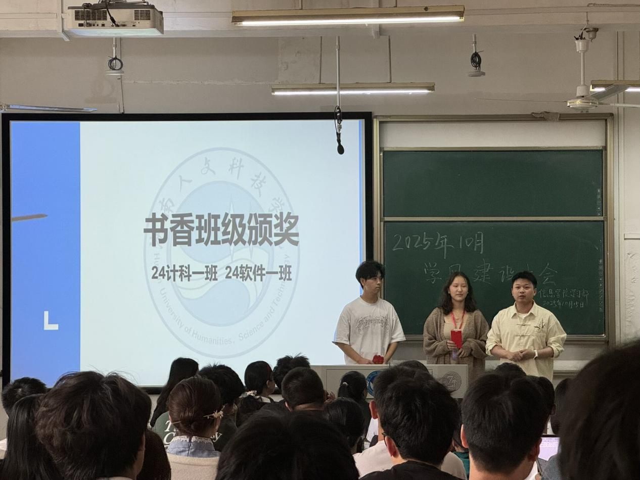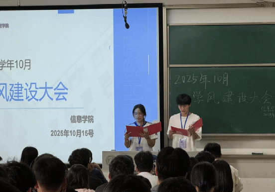 为营造良好学习氛围,打造优良上进的学风并积极迎接师范认证工作,信息学院于2025年10月15日中午在百全楼103召开学风建设大会。党总支副书记朱舒腊,辅导员代鑫龙、杨艺蕾、付妙、李海艳与各班主要班委参与会议。