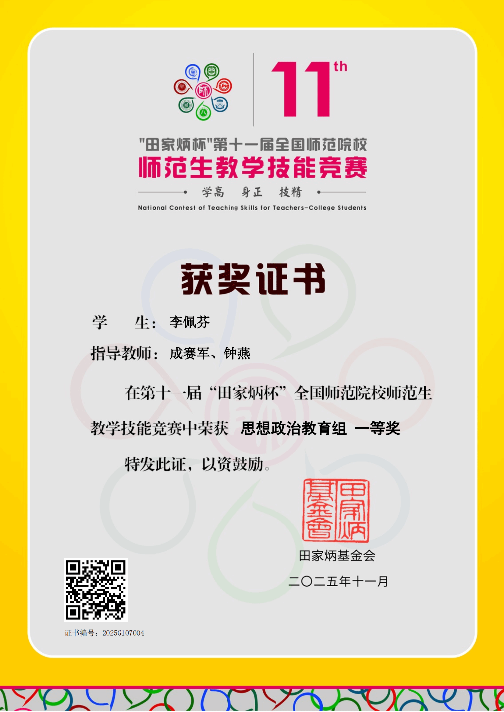 11月30日,第十一届“田家炳杯”全国师范院校师范生教学技能竞赛决赛圆满落幕。我校马克思主义学院李佩芬同学凭借扎实的专业素养与出色的教学表现,在比赛中脱颖而出,荣获一等奖,彰显了学校在思政师范人才培养方面的显著成效。