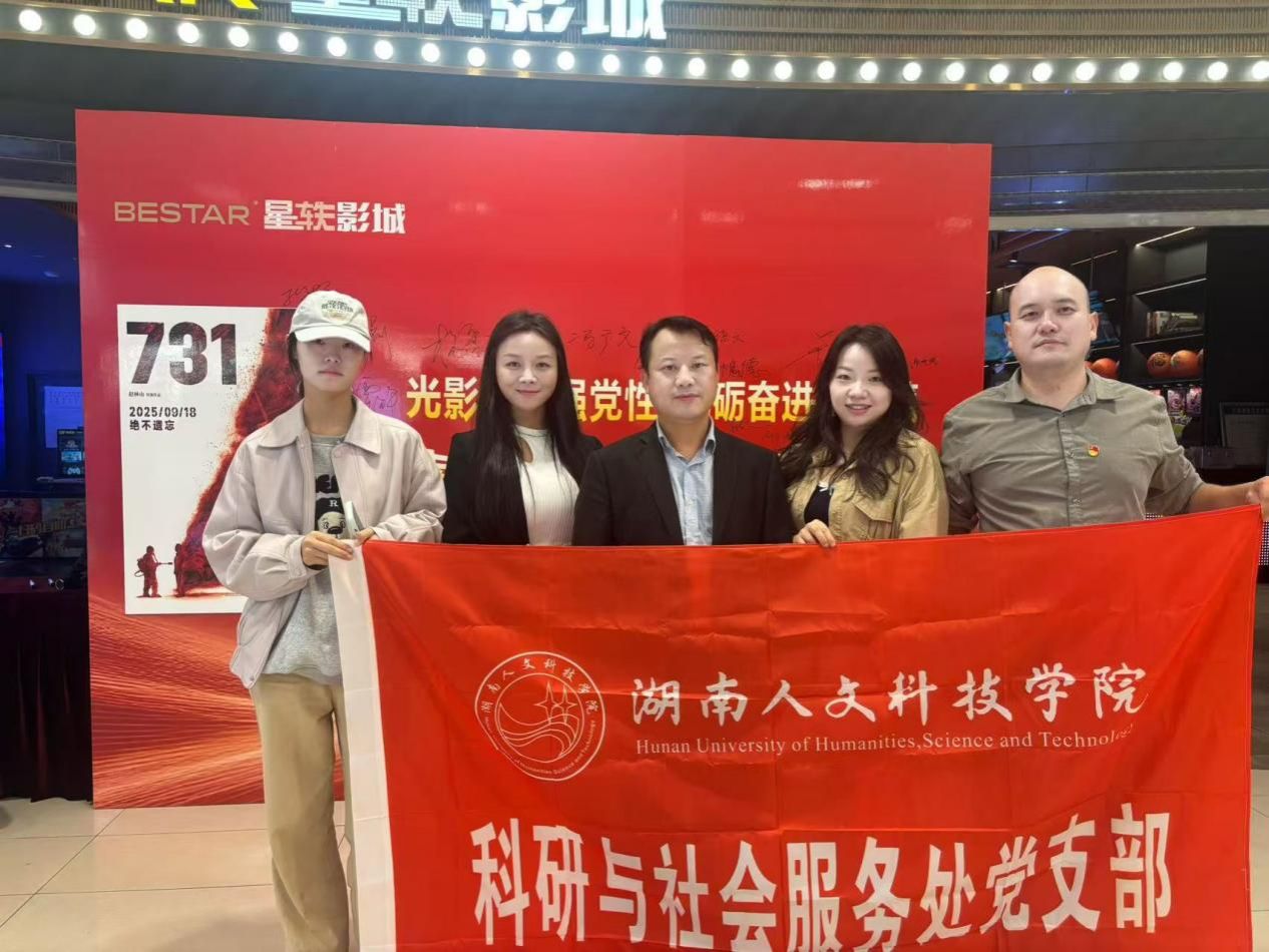 为深入开展爱国主义教育,弘扬伟大民族精神,进一步激发广大量师生的爱国热情和历史责任感,9月24日,我校党委组织全体教职工集中观看了爱国主义题材电影《731》,科研与社会服务处党支部全体党员前往观看。
