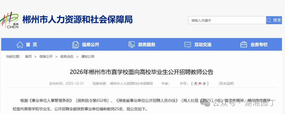 根据《事业单位人事管理条例》(国务院令第652号)、《湖南省事业单位公开招聘人员办法》(湘人社规〔2025〕1号)等文件精神,郴州市市直学校面向高等学校毕业生,公开招聘全额拨款事业单位编制教师25名,现公告如下。