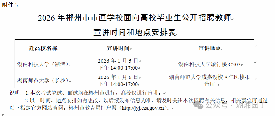 本次公开招聘教师将在湖南师范大学、湖南科技大学等2所高校开展宣讲,宣讲时间及地点详见《2026年郴州市市直学校面向高校毕业生公开招聘教师宣讲时间和地点安排表》。