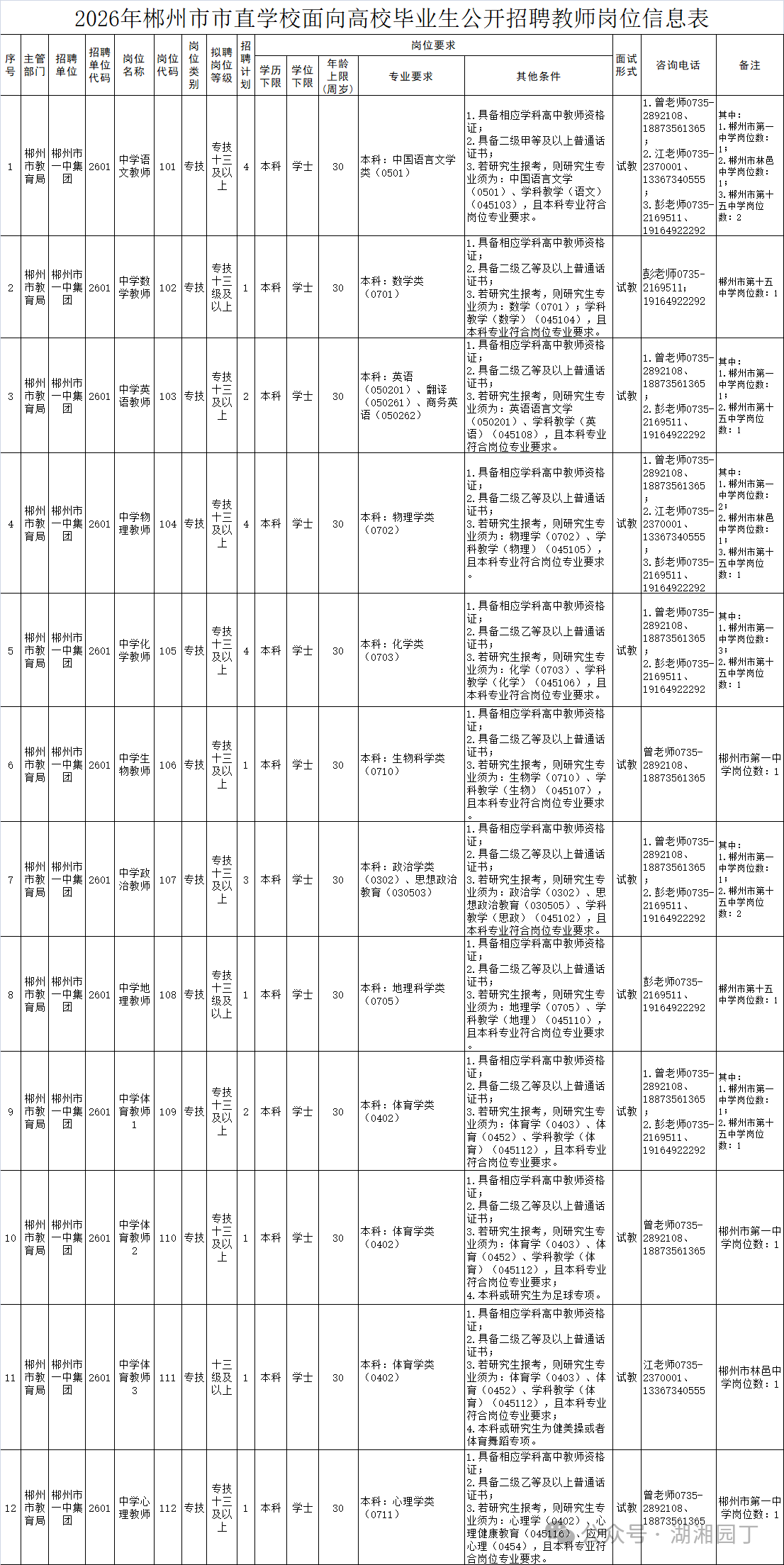 1.郴州市一中集团计划招聘教师25名,其中:郴州市第一中学12名、郴州市林邑中学(郴州市一中北校区)3名、郴州市第十五中学(郴州市一中南校区)10名。具体招聘岗位、计划数及资格条件等详见《2026年郴州市市直学校面向高校毕业生公开招聘教师岗位信息表》。