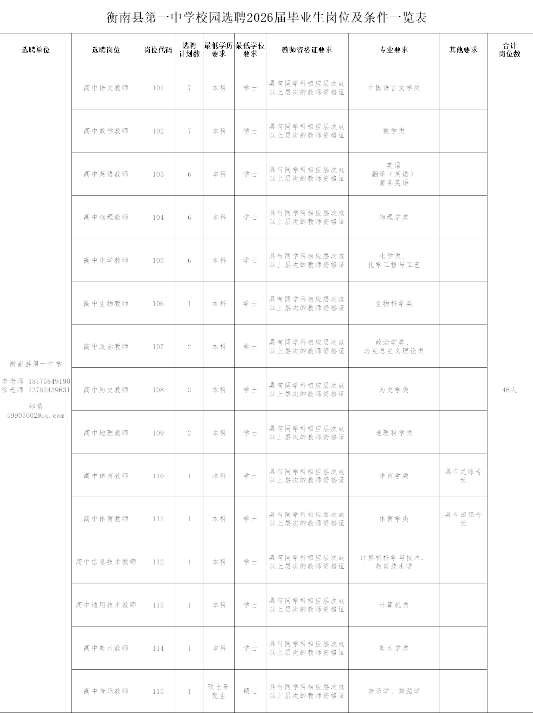 根据《事业单位人事管理条例》(国务院令652号)、《事业单位公开招聘人员暂行规定》(人事部令第6号)、《湖南省事业单位公开招聘人员办法》(湘人社规〔2025〕1号)、《中共衡阳市委办公室衡阳市人民政府办公室关于印发<衡阳市推进基础教育高质量发展若干措施>的通知》(衡办发〔2025〕8号)等文件精神,现将衡南县第一中学选聘46名2026届毕业生有关事项公告如下: