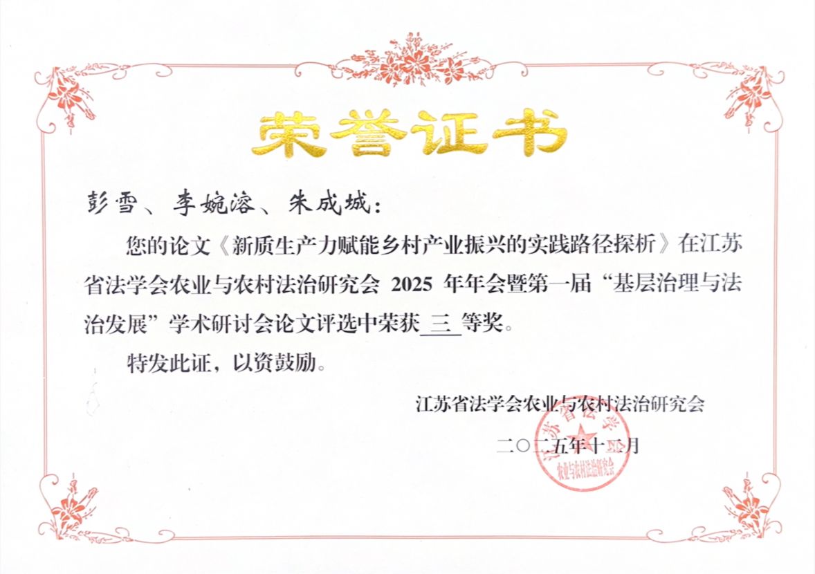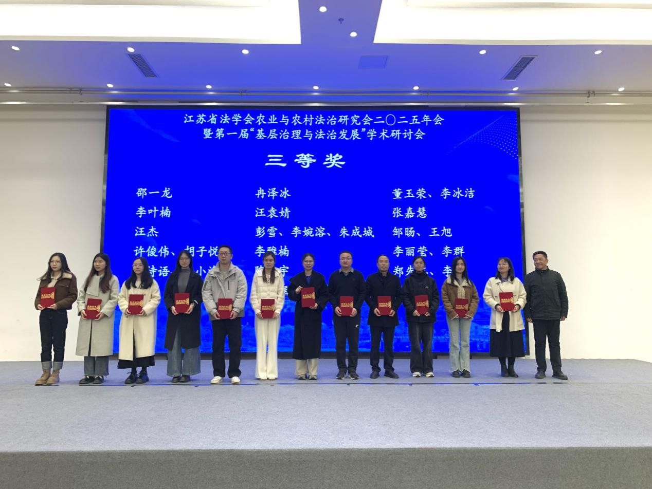 12月6日,江苏省法学会农业与农村法治研究会2025年会暨第一届“基层治理与法治发展”学术研讨会在江苏镇江召开。马克思主义学院教师李婉溶和彭雪、朱成城两位同学应邀参会。