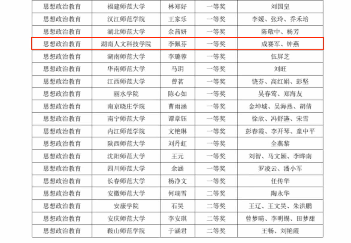 此次获奖不仅是学生个人专业能力的展现,更是学院持续深化师范专业内涵建设、完善“师德涵养、教学技能、综合素养”三位一体育人体系的生动实践。面向新时代思政课改革与基础教育发展的需求,马克思主义学院将牢记习近平总书记“办好思想政治理论课关键在教师”的重要嘱托,持续强化师资队伍建设,努力培养更多政治强、情怀深、思维新、视野广、自律严、人格正的优秀思政课教师,为培养担当民族复兴大任的时代新人贡献应有力量。(供稿人:李佩芬 供图人:钟燕 一审:钟燕 二审:成赛军 三审:于意)