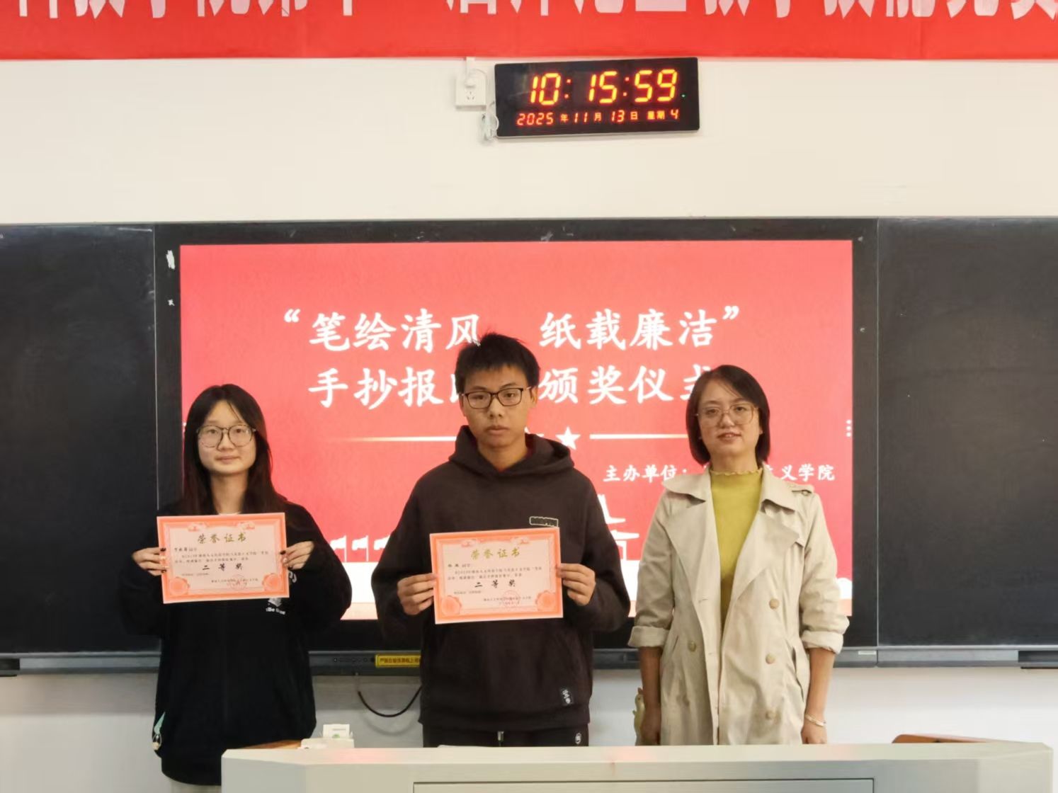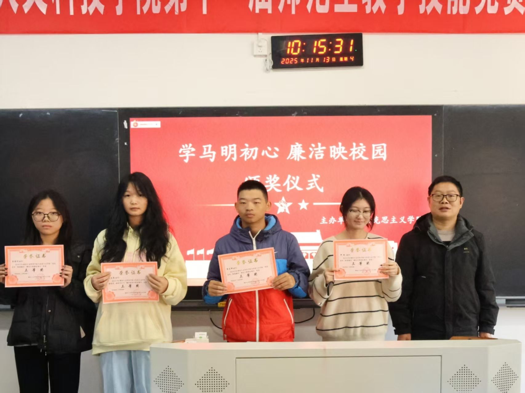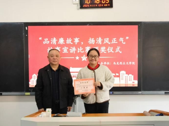 11月13日上午,马克思主义学院举办“廉洁”主题系列比赛颁奖仪式。学院党总支书记张卫明、党总支副书记阳青,学工办主任张得才参加此次颁奖仪式。