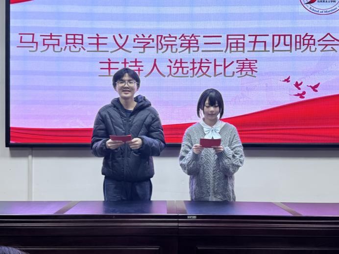 3月17日晚,马克思主义学院在若谷楼116会议室举办第三届五四晚会暨毕业晚会主持人选拔比赛。