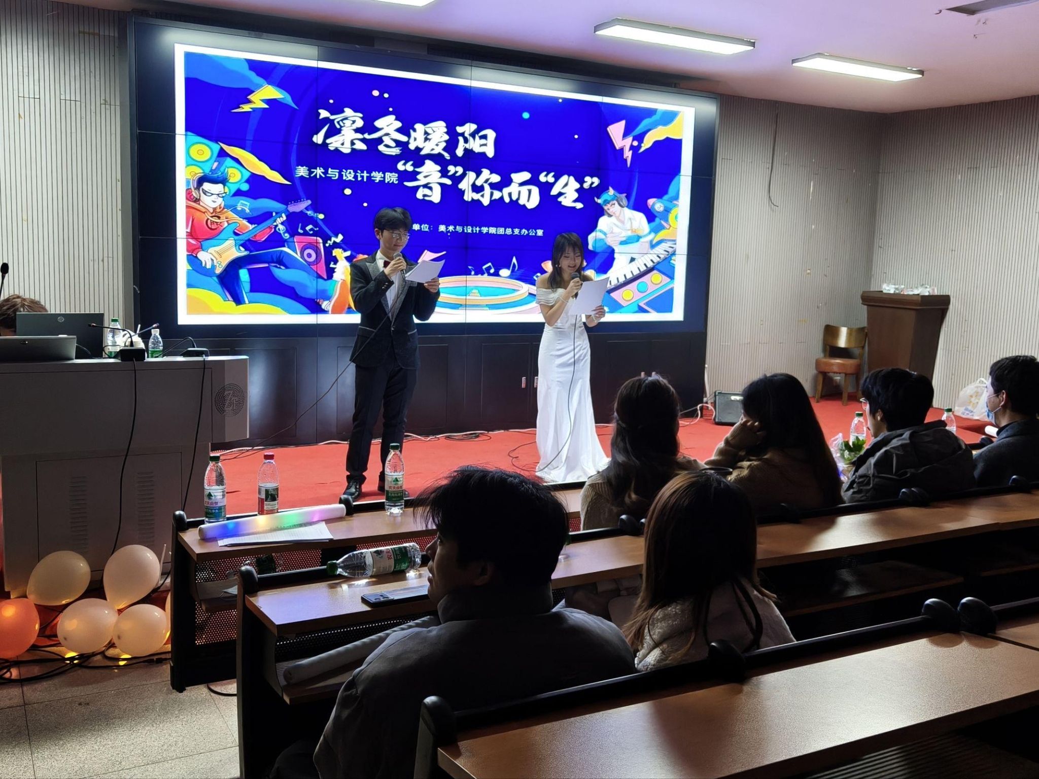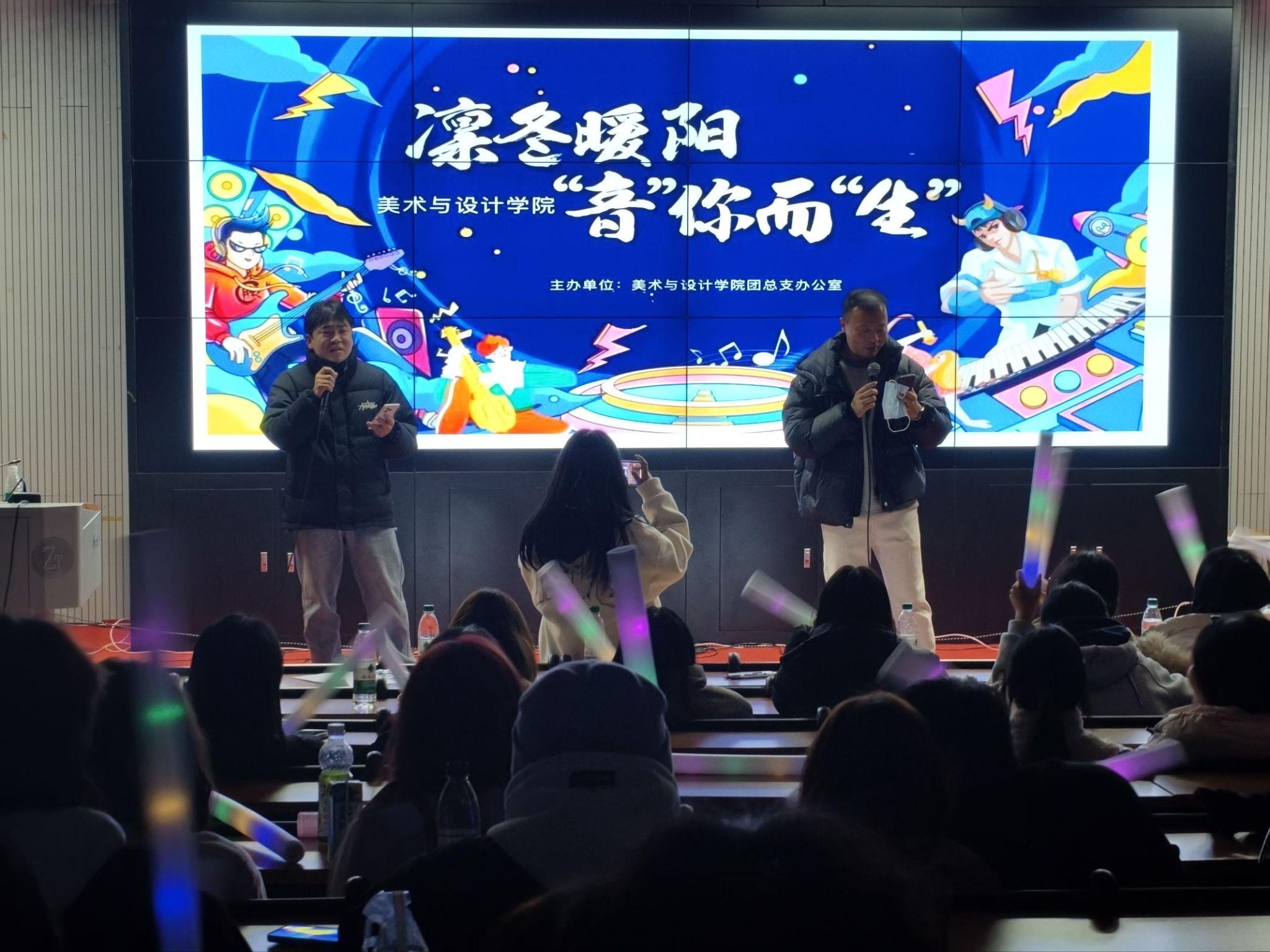 12月26日晚,美术与设计学院团总支办公室于学院一楼报告厅成功举办“凛冬暖阳·音你而生”音乐节。学院党总支副书记黄庆源、团总支书记邹凌云亲临现场,为参赛选手加油鼓劲,与全院师生共同感受音乐的魅力。