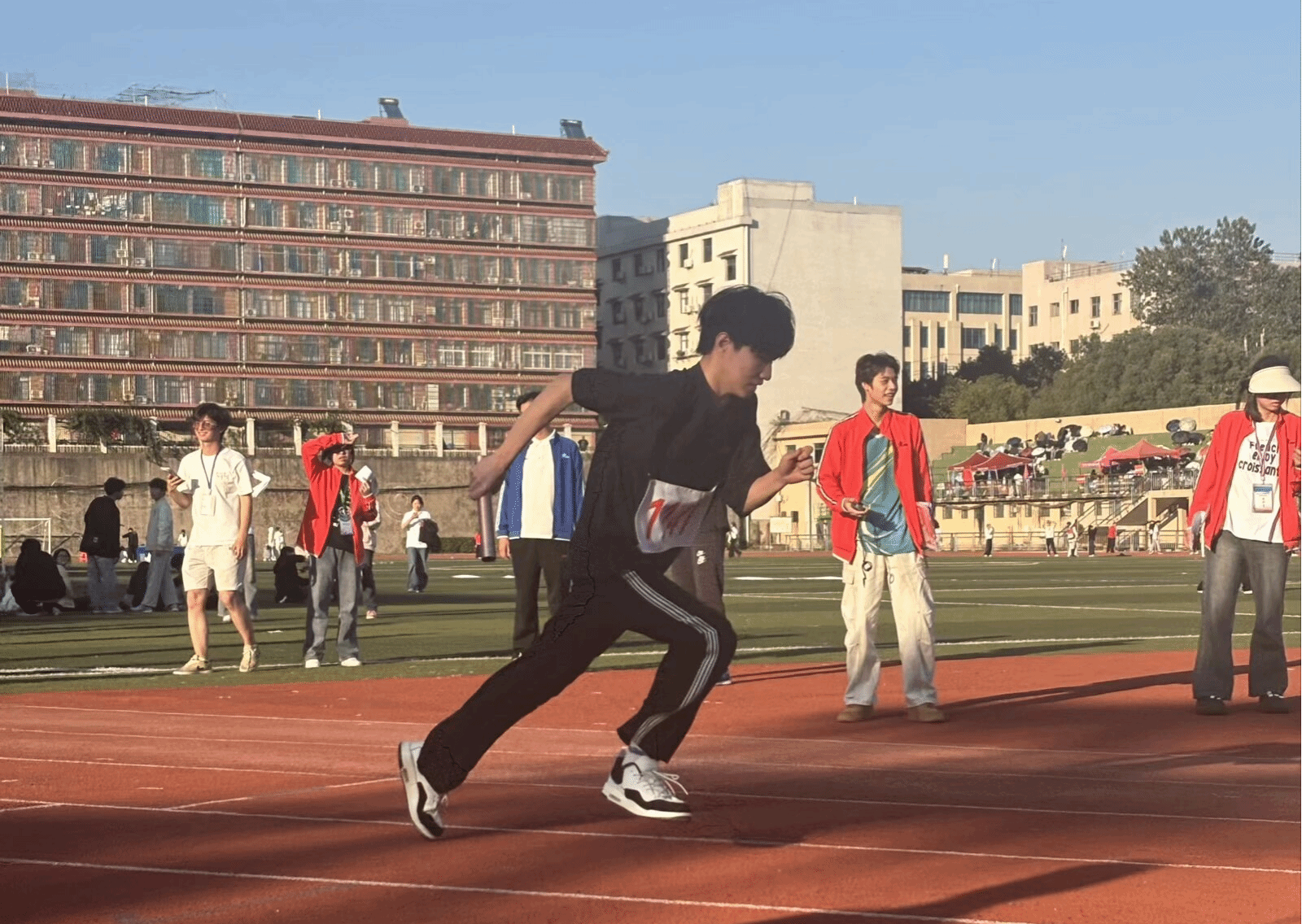 比赛中,面对实力强劲的对手,队员们始终保持昂扬斗志。发令枪响瞬间,第一棒朱虎如离弦之箭冲出起跑线,他紧盯前方赛道全力加速,为团队抢占先机。第二棒张楠提前启动,接棒时动作流畅自然,与第三棒赵俊翔的交接宛如行云流水,两人配合默契延续速度优势。最后一棒唐一沛肩负重托,在冲刺阶段面对对手紧逼仍稳住节奏,以坚定的信念完成最终冲击。四人全程配合无间,用奔跑诠释青春的热血与激情,用坚持展现出美院学子的别样风采。