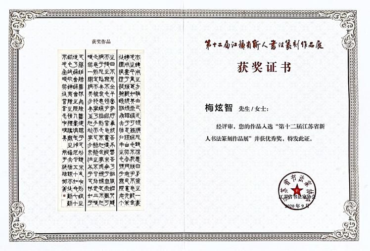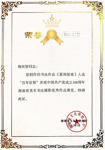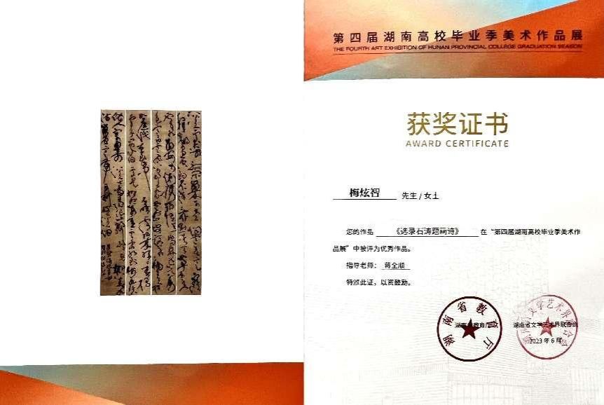 梅炫智,男,中共党员,美术与设计学院2023届书法学专业毕业生。2019年考入湖南人文科技学院美术与设计学院书法学专业,在校期间,他刻苦钻研书法技艺,深得师生赞誉。其作品多次在校内外展览中获奖,展现出扎实的功底和独特的艺术风格。在书法创作上,梅炫智注重传统笔墨精神,同时又探索现代审美表现形式,力求将传统与现代完美融合,巧妙地将古典雅韵融入现代设计理念,使每一笔每一划都充满了生命力。