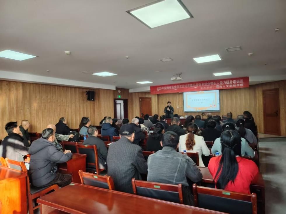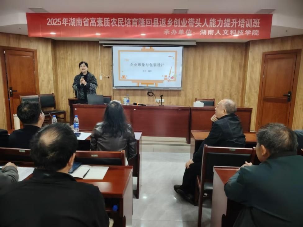 11月21日上午8点30,副院长童玲受邀在娄底市悦行酒店22楼欢致报告厅为2025年湖南省高素质农民培育邵阳市隆回县返乡创业带头人培训班进行《企业形象与产品包装设计》的知识讲座。