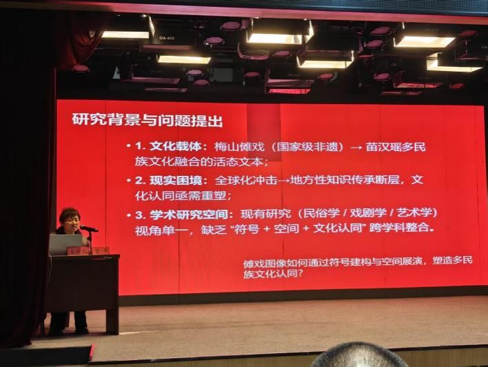 当日下午,在“中国傩戏的多元地域个案”学术报告专场中,贺平副院长以《文化认同视角下梅山傩戏图像的符号谱系与空间叙事》为题发表演讲。她结合自身前期对梅山傩戏图像开展的田野调研,立足美术设计专业视角,系统梳理了梅山傩戏中面具、服饰、道具等视觉图像的符号分类及其文化隐喻,指出这些图像符号既承载着驱邪禳灾的原始信仰,又凝聚着梅山地区民众的生产生活记忆与审美情趣。演讲中,她提出“图像符号的空间化呈现是构建文化认同的核心路径”的学术观点,为非遗戏剧的保护传承提供了跨学科研究视角。