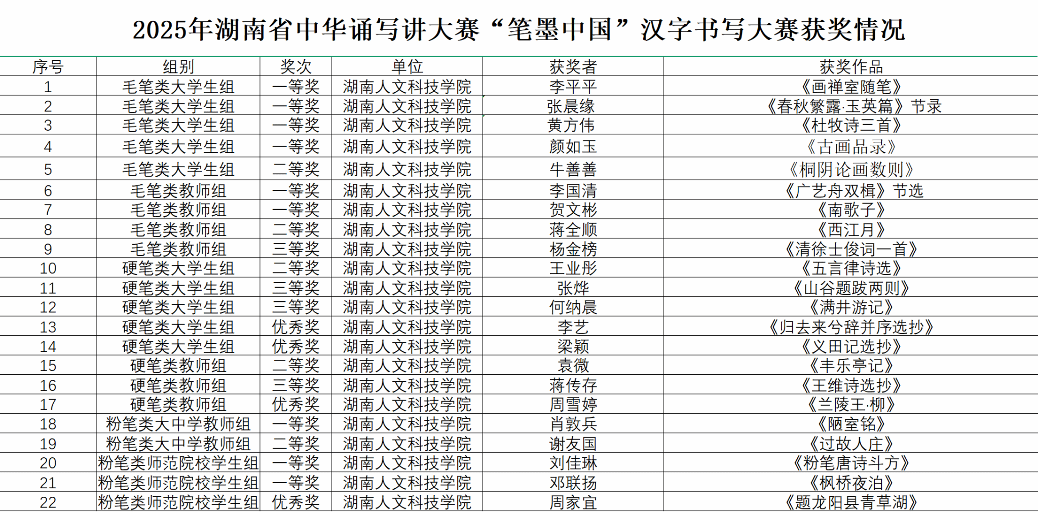 近日,由教育部、国家语言文字工作委员会联合主办的第七届中华经典诵写讲大赛“笔墨中国”汉字书写大赛获奖名单正式公布。湖南人文科技学院在此次大赛中表现优异,共斩获22项大奖,充分彰显了学校在中华优秀传统文化传承与书法艺术教育方面的雄厚实力。