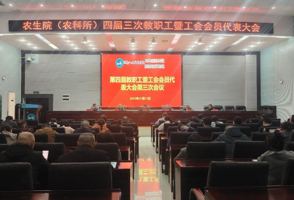 2025年11月11日,农生院(农科所)于图书馆二号报告厅隆重召开第四届三次教职工暨工会会员代表大会。大会由学院党总支副书记王东光主持,全体教职工均参与其中。