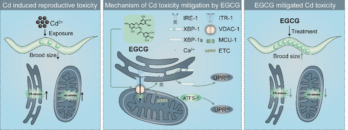 镉(Cd)是典型重金属污染物,可通过食物链危害生殖系统,而茶叶活性成分 EGCG 的解毒机制此前不明。团队以秀丽隐杆线虫为模型发现:100μM 镉暴露下,400μM EGCG 可使线虫产卵量提升 118.2%(p<0.001),且无镉环境中对生殖无不良影响。机制上,EGCG 通过 “双通路协同” 发挥作用:一是经 IRE-1/XBP-1 通路抑制内质网过度应激,二是维持线粒体电子传递链完整以恢复线粒体应激反应。更重要的是,研究首次证实“内质网-线粒体互作”是 EGCG 缓解镉毒性的核心环节。
