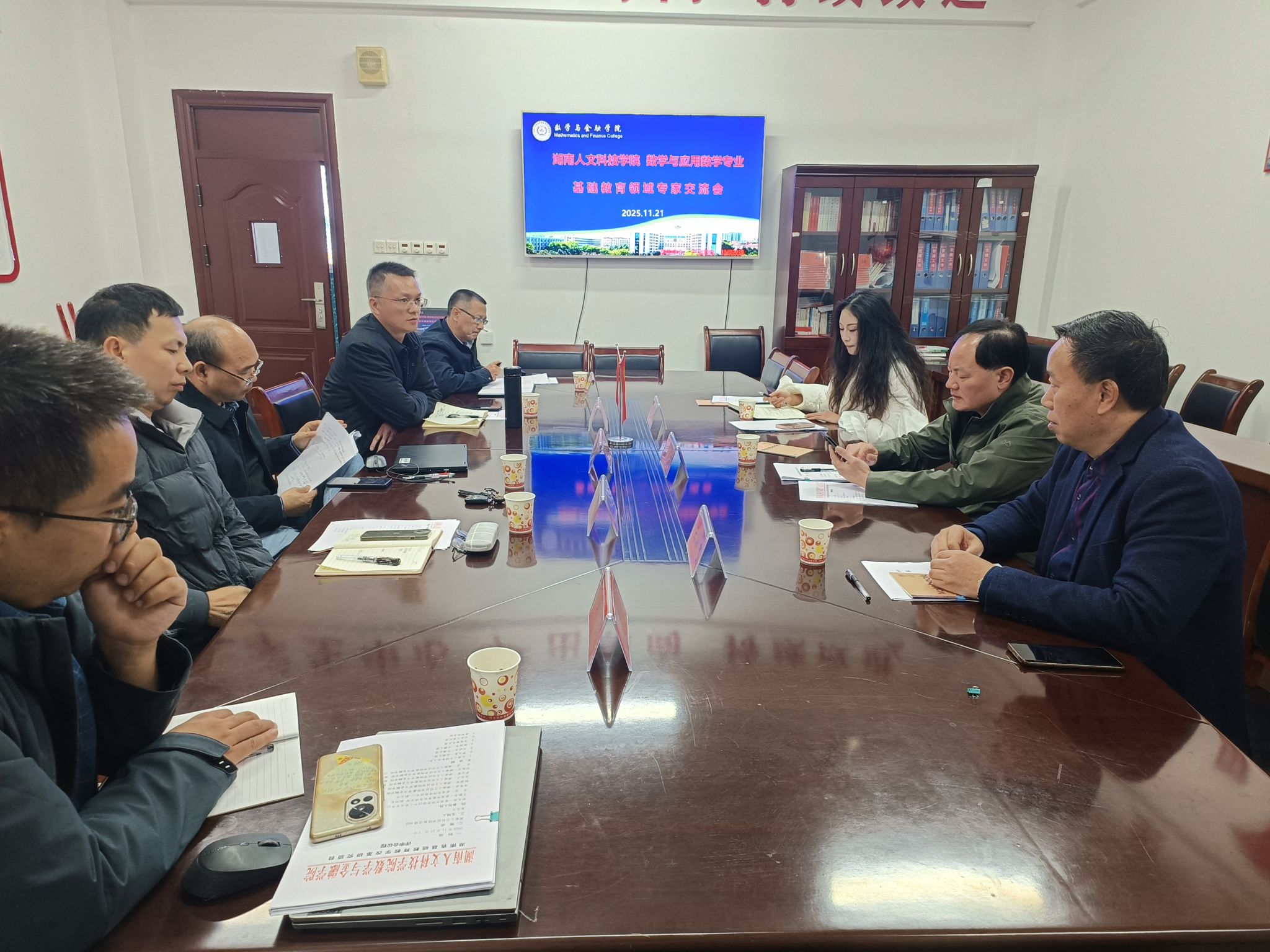 11月21日下午,学院举行数学与应用数学专业基础教育领域专家交流会,娄底市师资培训中心党总支书记邹兆林、市教科所副所长王献忠、市师资培训中心副主任吴芬应邀出席,学院党总支书记陈国华、院长李军成、副院长龙志文及部分教师代表参加交流,会议由副院长罗志军主持。