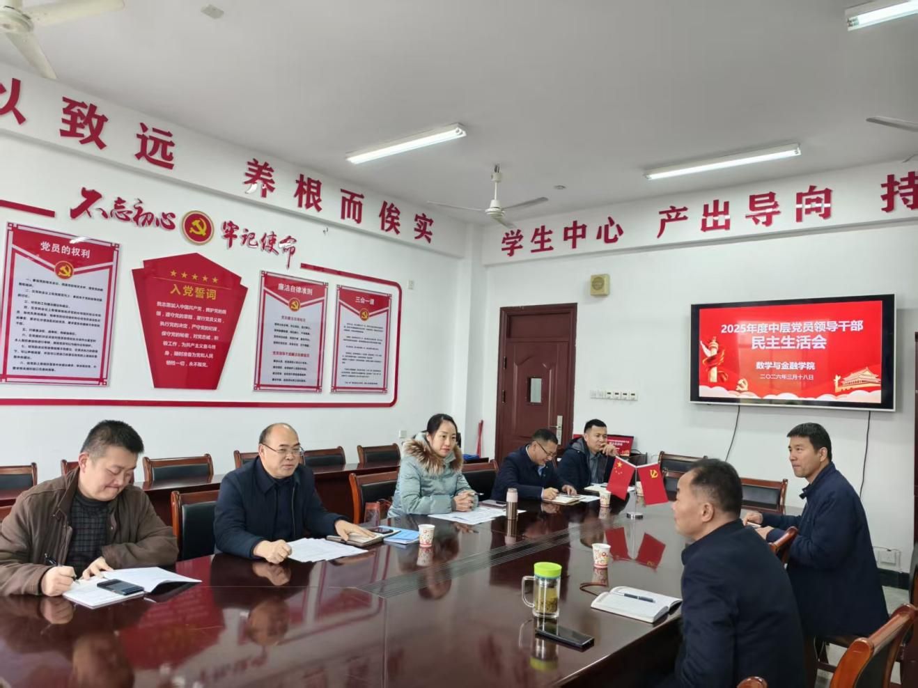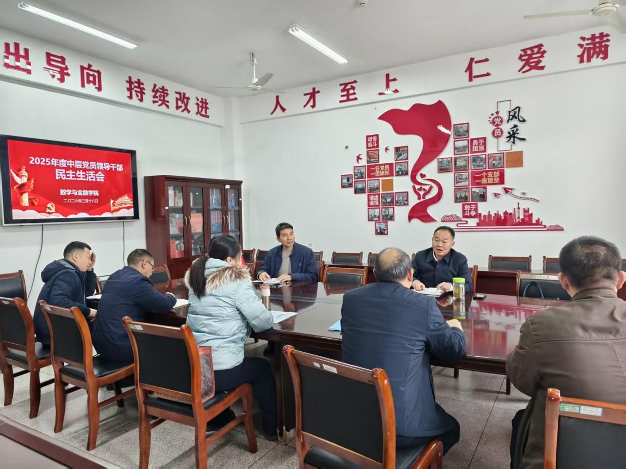 为深入学习贯彻习近平新时代中国特色社会主义思想,全面落实学校党委关于民主生活会的部署要求,严肃党内政治生活、强化领导班子政治建设,切实把巩固深化党纪学习教育成果融入班子建设全过程,3月18日下午,数学与金融学院在致远楼605会议室召开2025年度领导班子民主生活会。校党委副书记朱强、校审计处处长刘琼到会指导,学院领导班子成员陈国华、刘晔、罗志军、龙志文出席会议,李军成同志因外出学习请假。会议由学院党总支书记陈国华主持。