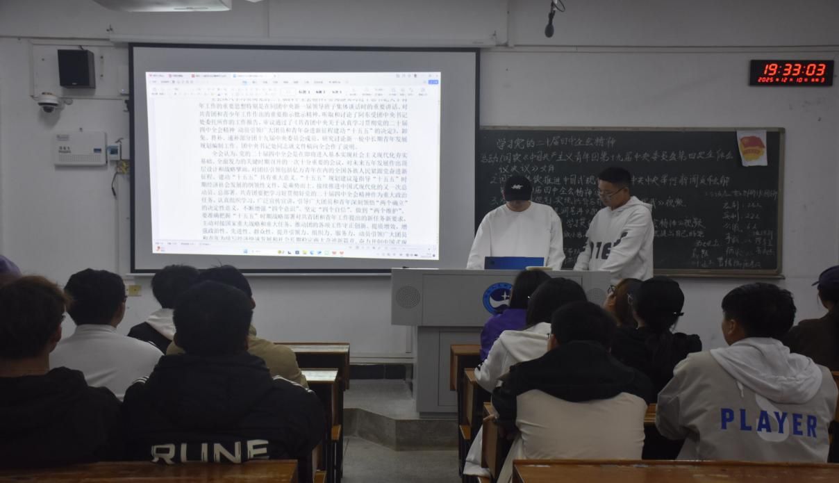 团课期间,主讲人以“‘十五五’规划绘就发展新蓝图”为引,通过解读《中共中央关于制定国民经济和社会发展第十五个五年规划的建议》核心框架与实践要求,生动阐释了《建议》对国家发展的战略意义与青年成长的指引价值,让同学们深刻认识到中国式现代化的宏伟前景与历史重任。在 “全会精神践行” 环节。主讲人从 “深学理论、精研专业、勇践行动” 三个维度展开,指出贯彻全会精神需立足实际,要以专业能力支撑高质量发展、以创新思维服务产业升级、以实干担当助力区域协调。主讲人强调,青年学生作为新时代建设者,既要从《建议》中汲取奋进力量,也要将个人发展融入国家大局,真正把全会精神转化为成长成才的实际行动。