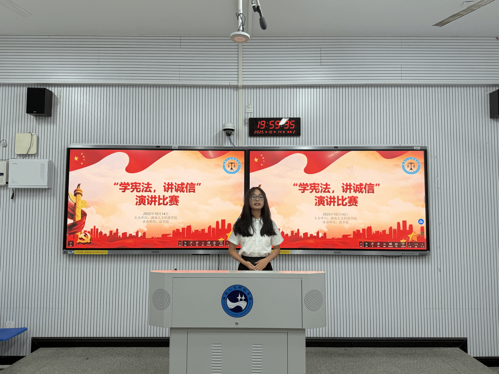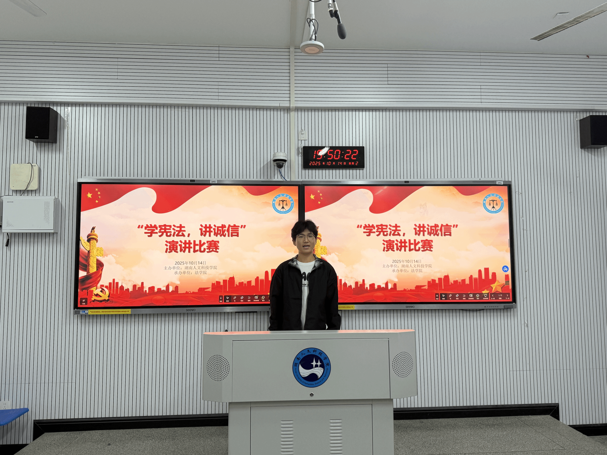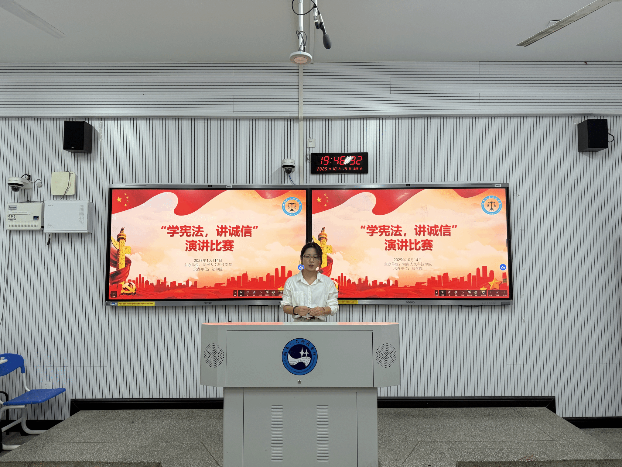 为深入学习宪法精神,弘扬诚信美德,由湖南人文科技学院主办,法学院承办的“学宪法,讲诚信”演讲比赛于10月14日晚上在致远楼圆满落幕。本次比赛特邀校宣传部刘惠娟、文学院王文静、陈茜茜三位老师担任评委,各学院共计10位选手同台竞技。