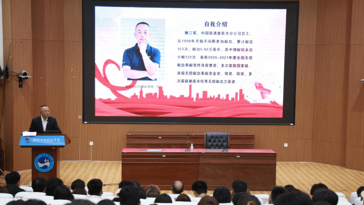 11月4日晚,由娄底市卫生健康委员会主办,湖南人文科技学院与娄底市中心血站联合承办的“健康知识普及·我行动”高校学生健康教育宣讲活动,在匠成楼报告厅圆满落下帷幕。活动由校团学会主席李朕宇主持,娄底市中心血站支部委员、工会主席肖磊,校团委书记刘佳,教工团总支书记徐彬出席活动。宣讲环节特邀娄底市中心血站的廖旭、曾梅进行专题讲解,并邀请了百次献血志愿者姚三军现场分享献血心路历程,约300名学生代表共同参与。