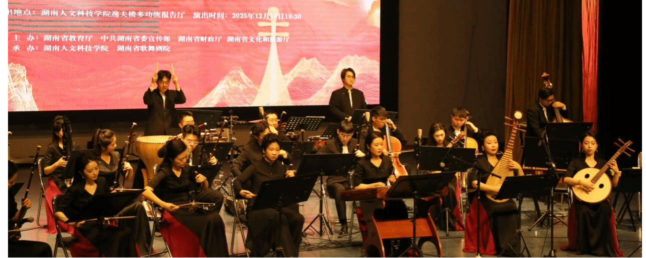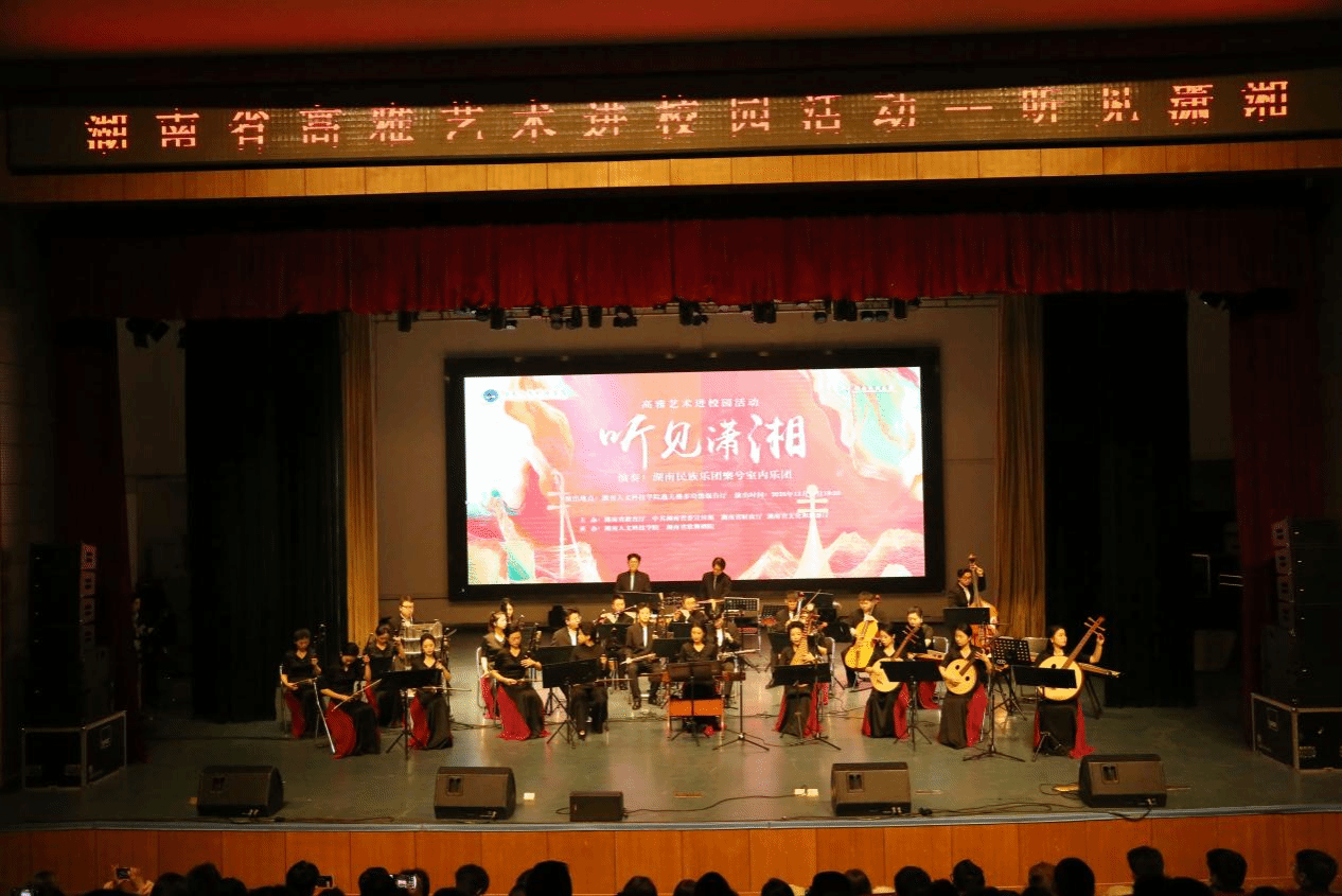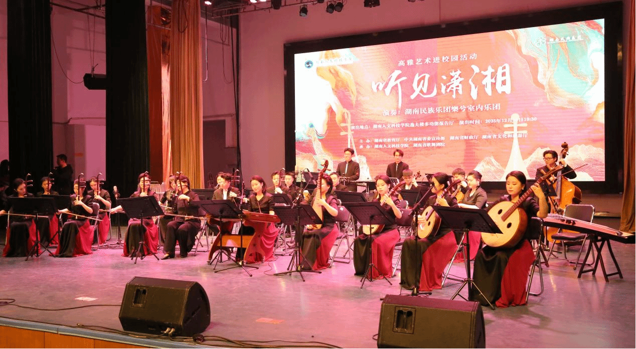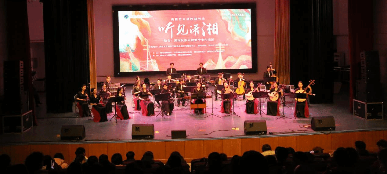 12月10日晚,由湖南省教育厅、中共湖南省委宣传部、湖南省财政厅、湖南省文化和旅游厅联合主办,湖南人文科技学院和湖南省歌舞剧院承办的高雅艺术进校园活动在逸夫楼多功能报告厅开展。湖南民族乐团樂兮室内乐团20余位演奏家倾情演绎。校党委委员、副校长刘铁峰,校党委委员、副校长谭峰亮,湖南民族乐团团长曹鹏出席活动。全校600余名师生观看了表演。