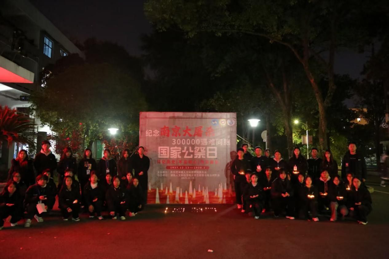 2025年12月13日,第十二次南京大屠杀死难者国家公祭日之际,湖南人文科技学院积极响应中央号召,由校团委青年志愿者工作部联合大学生时事与政治研究会在若谷楼前坪组织了庄严肃穆的悼念活动。