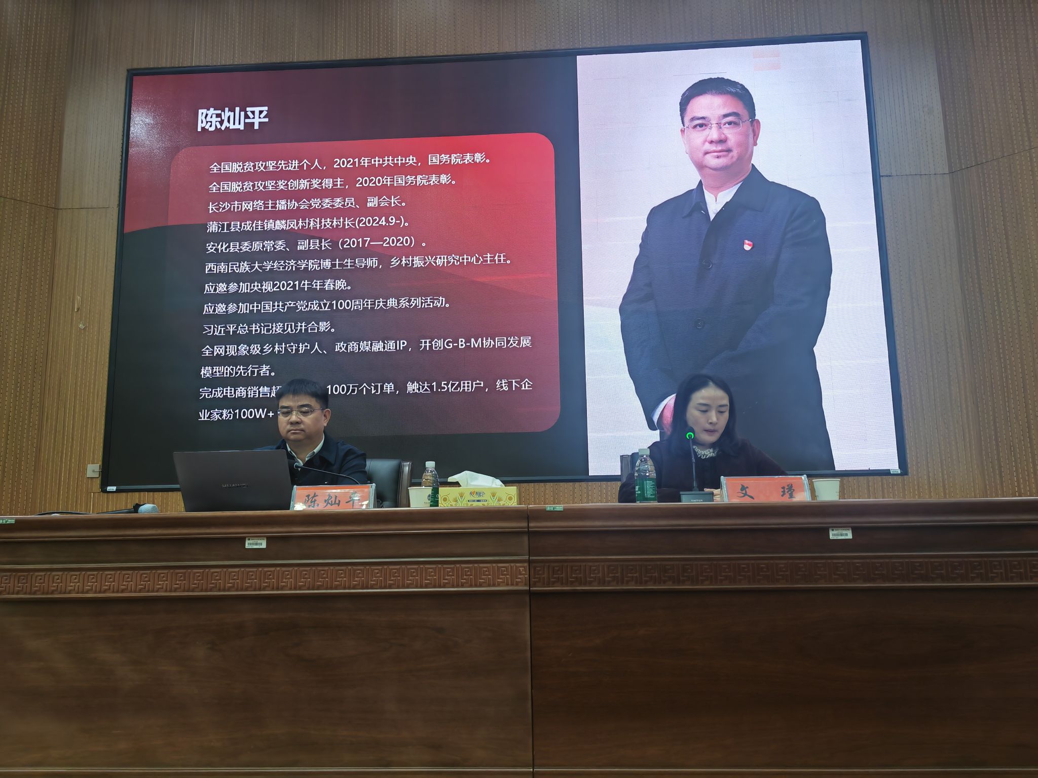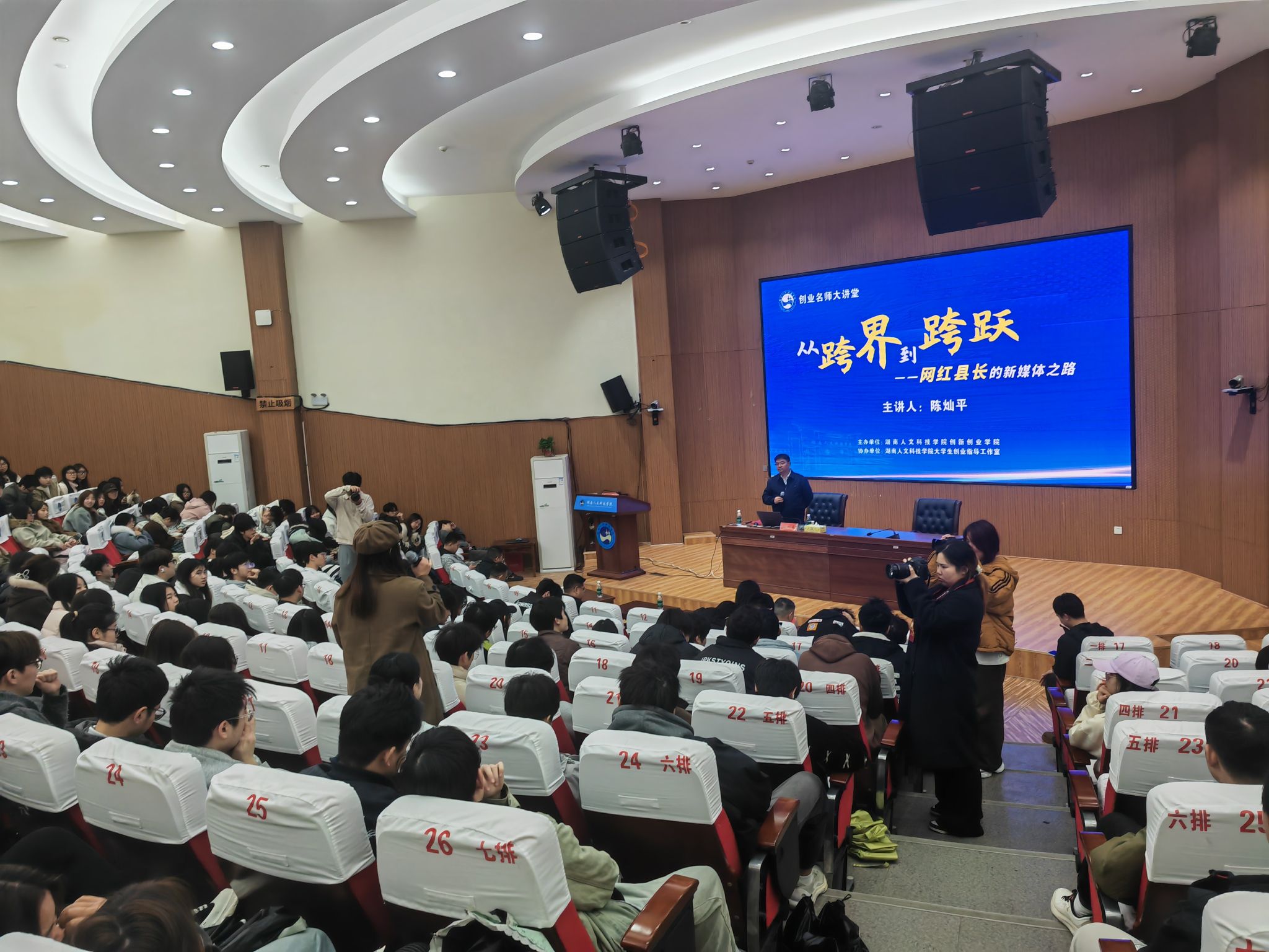 报告会上,陈灿平以《从跨界到跨跃——“网红县长”的新媒体之路》为主题,结合自身从高校教师转型为挂职干部、再成长为“网红县长”的经历,深入分享了新媒体赋能乡村振兴的实践路径与经典案例。他围绕电商直播“做了啥、为啥做、怎么做”、个人IP的设计打造、公域与私域流量运营、短视频拍摄制作逻辑、直播选品与策划等核心内容,进行了系统讲解与实战经验分享,赢得了现场师生的阵阵掌声。