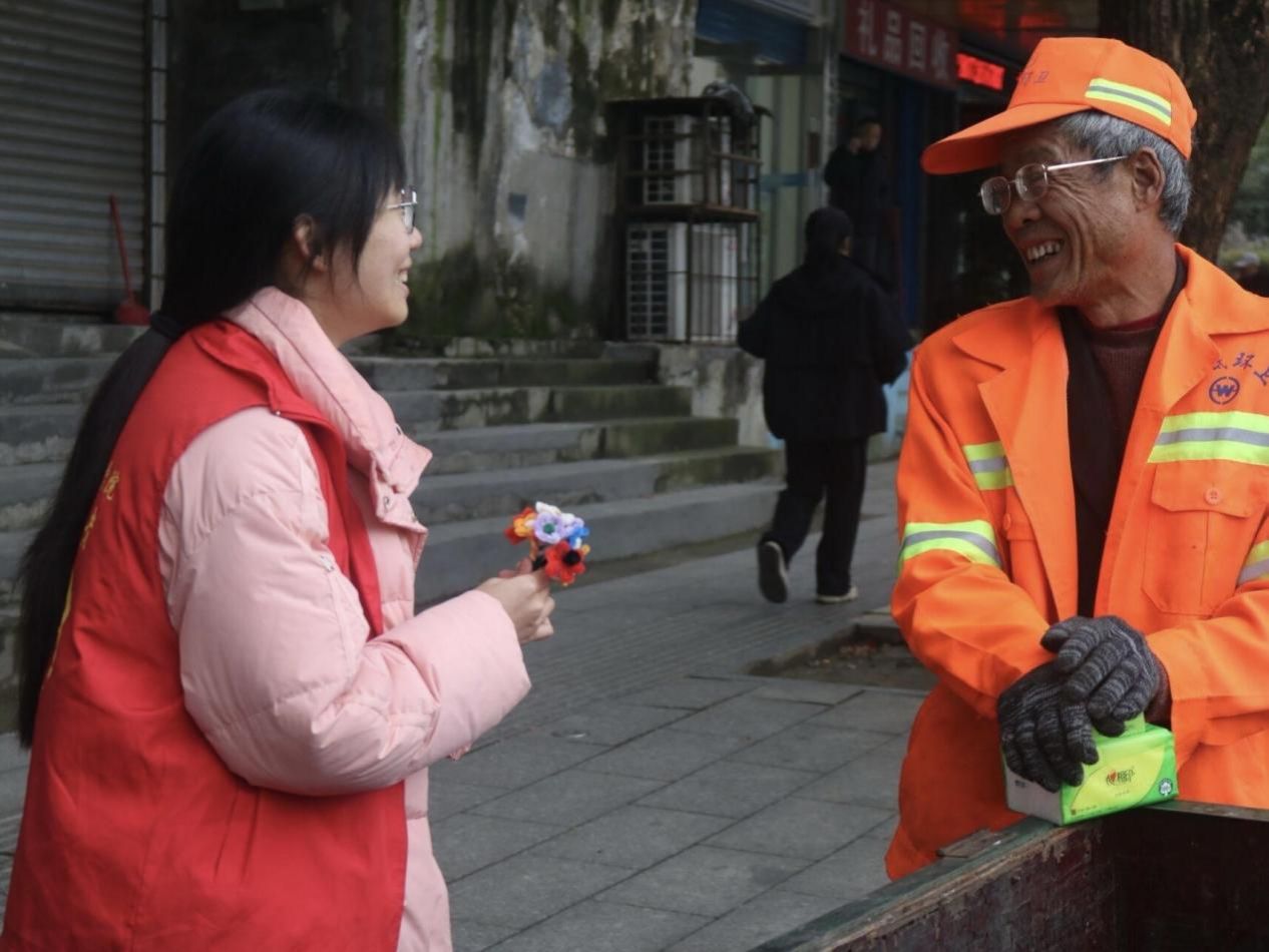 情系基层敬劳动者,点滴行动悟初心。材料与环境工程学院开展 “锋行暖城,花赠劳者” 活动,志愿者走进氐星路大科街道,与环卫工人面对面交流,倾听其凌晨劳作、冒雨清障的艰辛,送上实用物资与手工 “小红花”,让青年学子深刻体悟 “爱岗敬业、甘于奉献” 的雷锋精神内涵。