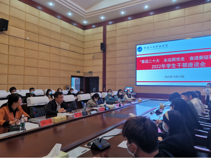 在喜迎党的二十大召开之际,10月14日上午,我校团委组织学生干部代表60余人在图书馆一会议室召开了以“喜迎二十大 永远跟党走 奋进新征程”为主题的2022年学生干部座谈会。校党委委员、副校长曹鑫与学生工作处、团委的领导老师一起出席了座谈会。