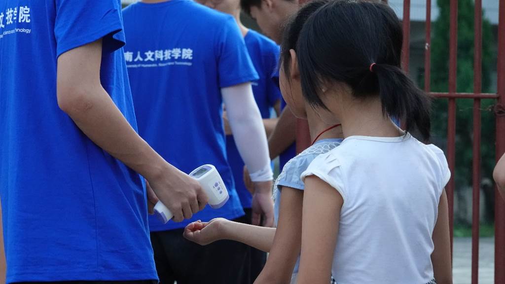(图为志愿者为孩子们测量体温)