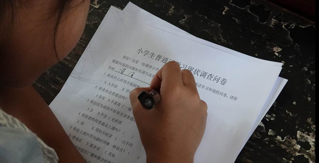(图为孩子在认真填写小学生普通话学习状况调查问卷)