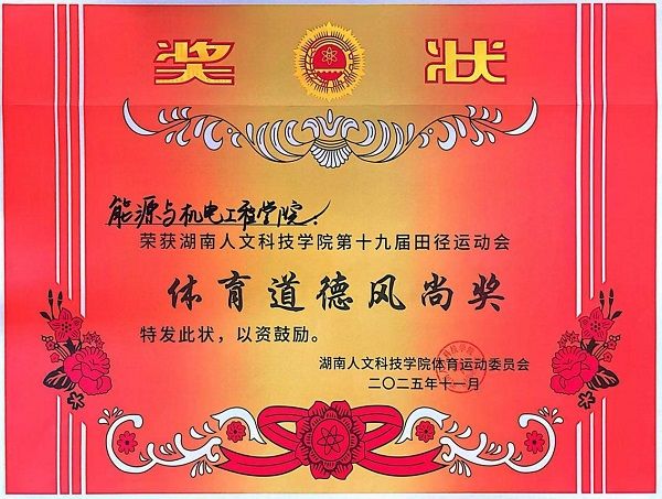 在近日圆满落幕的湖南人文科技学院第19届田径运动会上,能源与机电工程学院以出色的精神风貌、严谨的组织纪律和温暖的团队情谊,荣获含金量十足的“体育道德风尚奖”,充分展现了能机学子昂扬向上、团结友爱的集体形象。